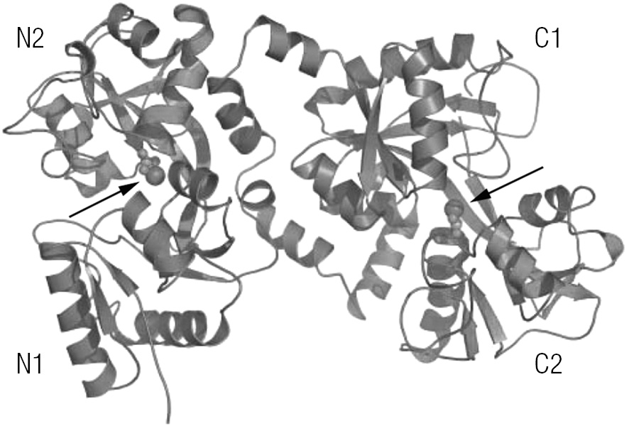 Fig. 1. Ribbon diagram of human lactoferrin. The N-lobe is on the left, with its bound Fe3+ and CO32– ions (shown as spherical atoms, indicated by arrows) in the cleft between the two domains, N1 and N2. Similarly, for the C-lobe (right) the C1 and C2 domains with the Fe3+ and CO32– ions in between. The two lobes are joined by a three-turn helix [19]