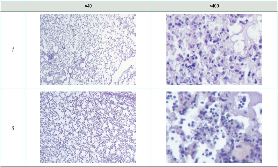 Fig. 2. Lung parenchyma of mice. Hematoxylin and eosin staining, magnification ×40 and ×400. a — intact mice; b — 2nd group on 4th day; c — 3rd group on 4th day; d — 2nd group on 7th day; e — 3rd group on 7th day; f — 2nd group on 14th day; g — 3rd group on 14th day