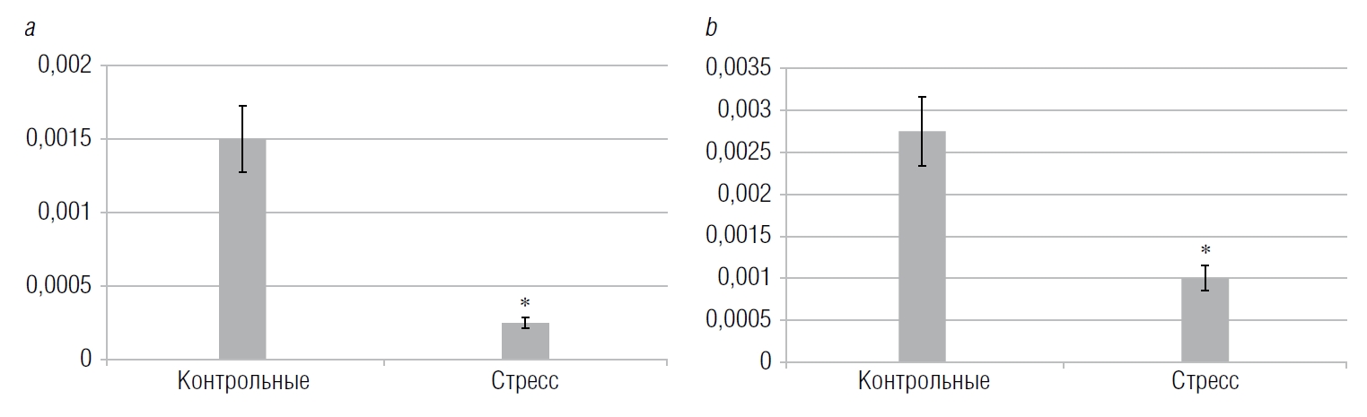 Рис. 3. Относительная степень экспрессии генов IL-4 (a) и IL-6 (b) в тимусах экспериментальных животных, не подвергавшихся стрессорному воздействию, а также после аппликации хронического стресса. * р < 0,05 по сравнению с контрольными животными