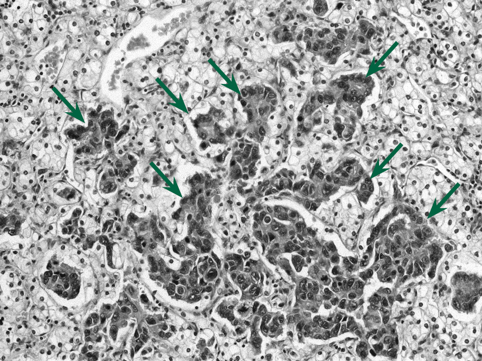 Рис. 1. Метастаз рака молочной железы (стрелки) в светлоклеточную карциному почки. Окраска гематоксилином и эозином, ×200