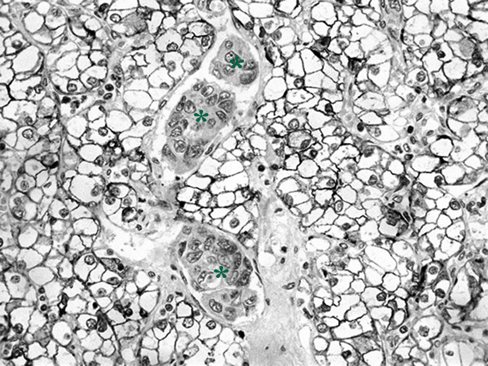 Рис. 2. Положительная мембранная реакция на CD10 в опухоли почки («звездочки» указывают на неокрашенные хромогеном кластеры метастатических элементов). Иммуногистохимия, ×400