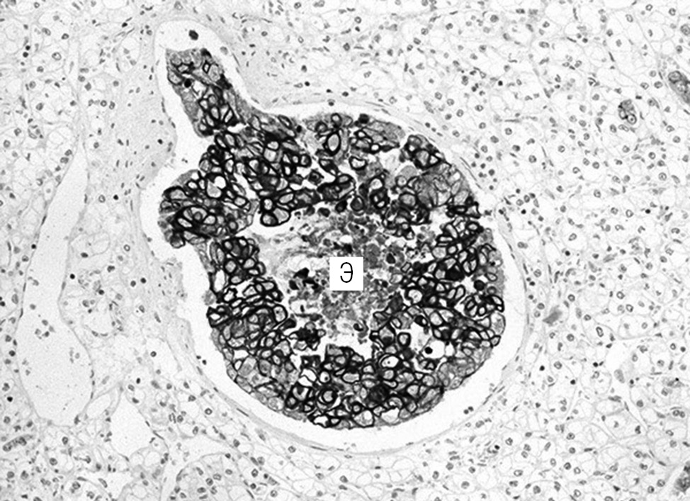 Рис. 3. Положительная реакция на цитокератин 7 в раковом эмболе (Э) в опухоли почки. Иммуногистохимия, ×400