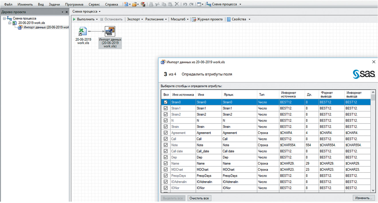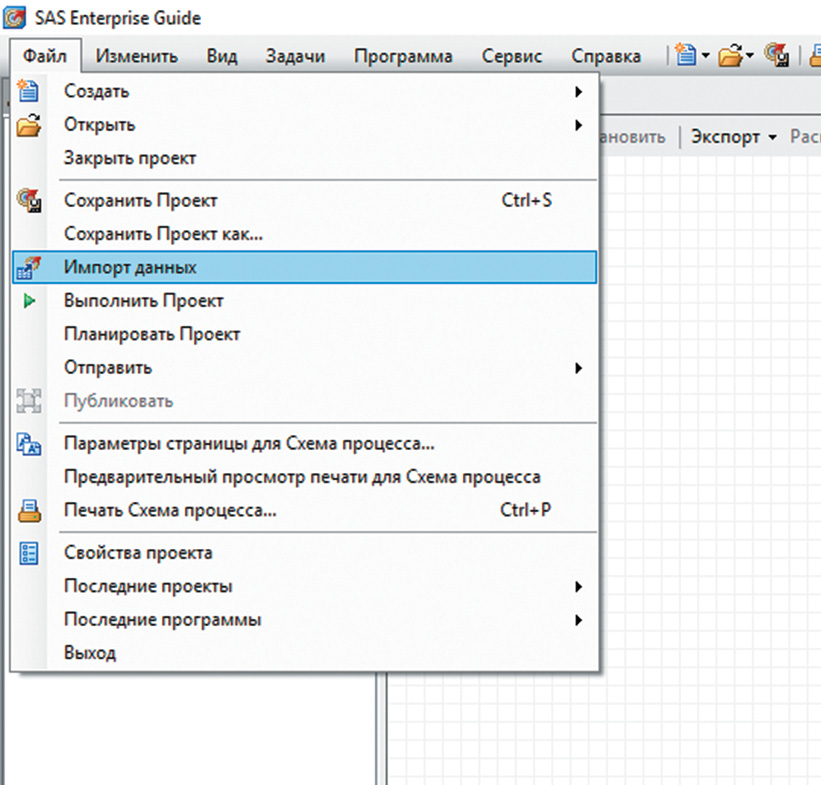 Загрузку базы данных из файла Excel в SAS Еnterprise guide 6.1 (все переменные должны быть на латинице и не содержать конфликтных символов) выполняли через меню «Файл» → «Импорт данных» (рис. 2, 3).