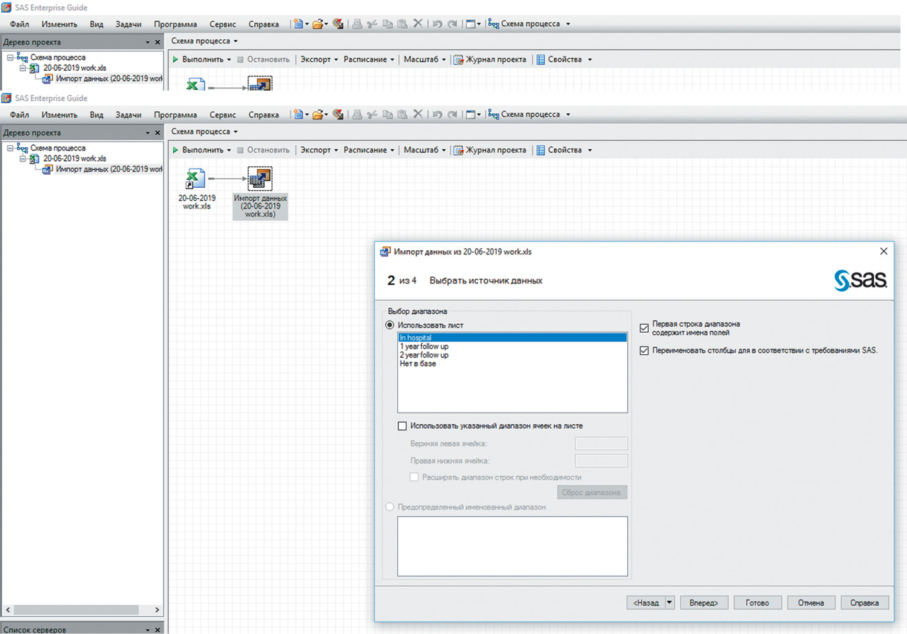 Ставили галочку напротив «Переименовать столбцы в соответствии с требованиями SAS Enterprise Guide 6.1», отмечали лист Excel, с которым будем работать (в нашем случае In hospital), нажимали «Вперед» (рис. 5).