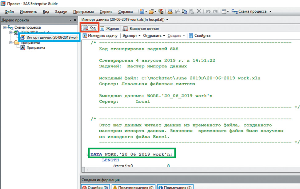 При использовании процедур необходимо указывать название таблицы, с которой работаешь. Чтобы узнать название таблицы, нужно щелкнуть мышью два раза на вкладку «Импорт данных» (голубая рамка), выбрать «Код» (красная рамка), скопировать имя таблицы после слова DATA (зеленая рамка) (рис. 11).