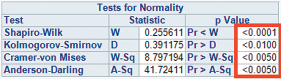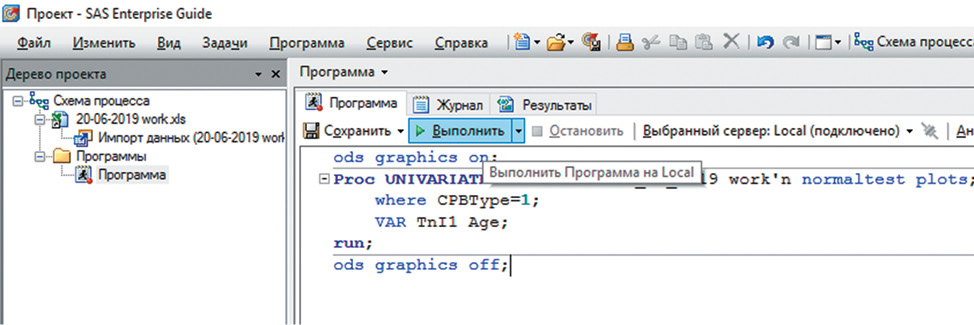 Представленные нами результаты являются итогом предварительного этапа обработки данных, обязательного для любого исследования, который позволяет выбрать адекватные статистические тесты. Следует отметить, что концентрация маркеров и ферментов очень часто имеет логнормальное распределение, поэтому с практической точки зрения переменные, содержащие концентрации, можно сразу логарифмировать, после чего проверять нормальность распределения. Несмотря на то что в случае распределения, отличающегося от нормального, можно использовать непараметрические тесты, предпочтительнее перейти к нормальному виду, взяв десятичный или натуральный логарифм, так как многие статические тесты были разработаны для нормального распределения. Проверка на нормальность является простой процедурой, которую можно выполнить в любой программе для статистических расчетов, однако приведенный пошаговый и подробный алгоритм может стать первым шагом к освоению программы SAS Enterprise Guide 6.1, имеющей мощные инструменты обработки данных, которые гораздо удобнее по сравнению с инструментами, предлагаемыми в других пакетах статистических расчетов. Реализованный алгоритм представлен с таким расчетом, чтобы читатели, никогда не работавшие с данной программой, могли сразу же использовать приведенный выше код для своей базы данных, поменяв названия переменных и файла в соответствии с базой данных. SAS — один из самых популярных программных пакетов, используемых для обработки данных медицинских исследований в США, и снабжен набором инструментов для работы с большими объемами данных [4]. По сравнению с другими статистическими программами SAS обладает следующими преимуществами: