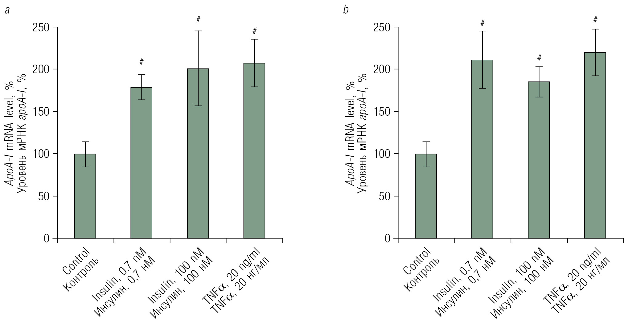 Рис. 1. Повышение уровня матричной РНК aроA-I в макрофагах под действием инсулина. Макрофаги, дифференцированные из моноцитов периферической крови человека в течение 5 сут (a), макрофаги THP-1 (b). Указан относительный уровень экспрессии мРНК aроА-I, где за 100 % принят уровень мРНК в нестимулированных макрофагах. На диаграммах представлены средние значения ± ошибка среднего. # p < 0,01 (t-критерий)