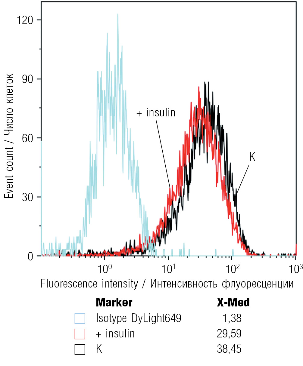 Рис. 2. Уменьшение уровня поверхностного белка АроА-I в макрофагах под действием инсулина. K — контрольные, не обработанные инсулином макрофаги; + insulin — макрофаги, инкубированные с инсулином; X-Med — медиана интенсивности флуоресценции