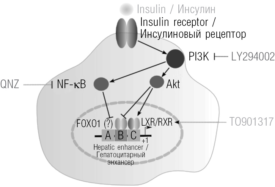 Рис. 3. Схема сигнальных каскадов, инициируемых инсулином: QNZ — ингибитор NF-κB; LY294002 — ингибитор PI3K; ТО901317 — агонист LXRs