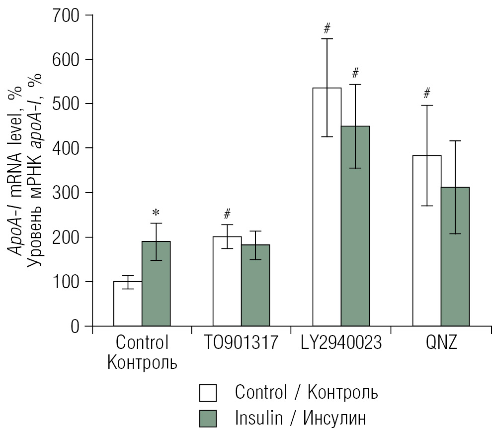 Рис. 4. Влияние инсулина на уровень мРНК apоА-I: роль ядерных рецепторов LXRs, PI3K и фактора транскрипции NF-κB. Указан относительный уровень экспрессии мРНК apoА-I, где за 100 % принят уровень мРНК в нестимулированных макрофагах. На диаграмме представлены средние значения уровня мРНК apoA-I ± ошибка среднего. Критерий Стьюдента — * p < 0,05. Критерий Даннета — # p < 0,01. Столбцы белого цвета отображают интенсивность транскрипции в контрольных клетках, столбцы черного цвета — интенсивность транскрипции в клетках, обработанных инсулином