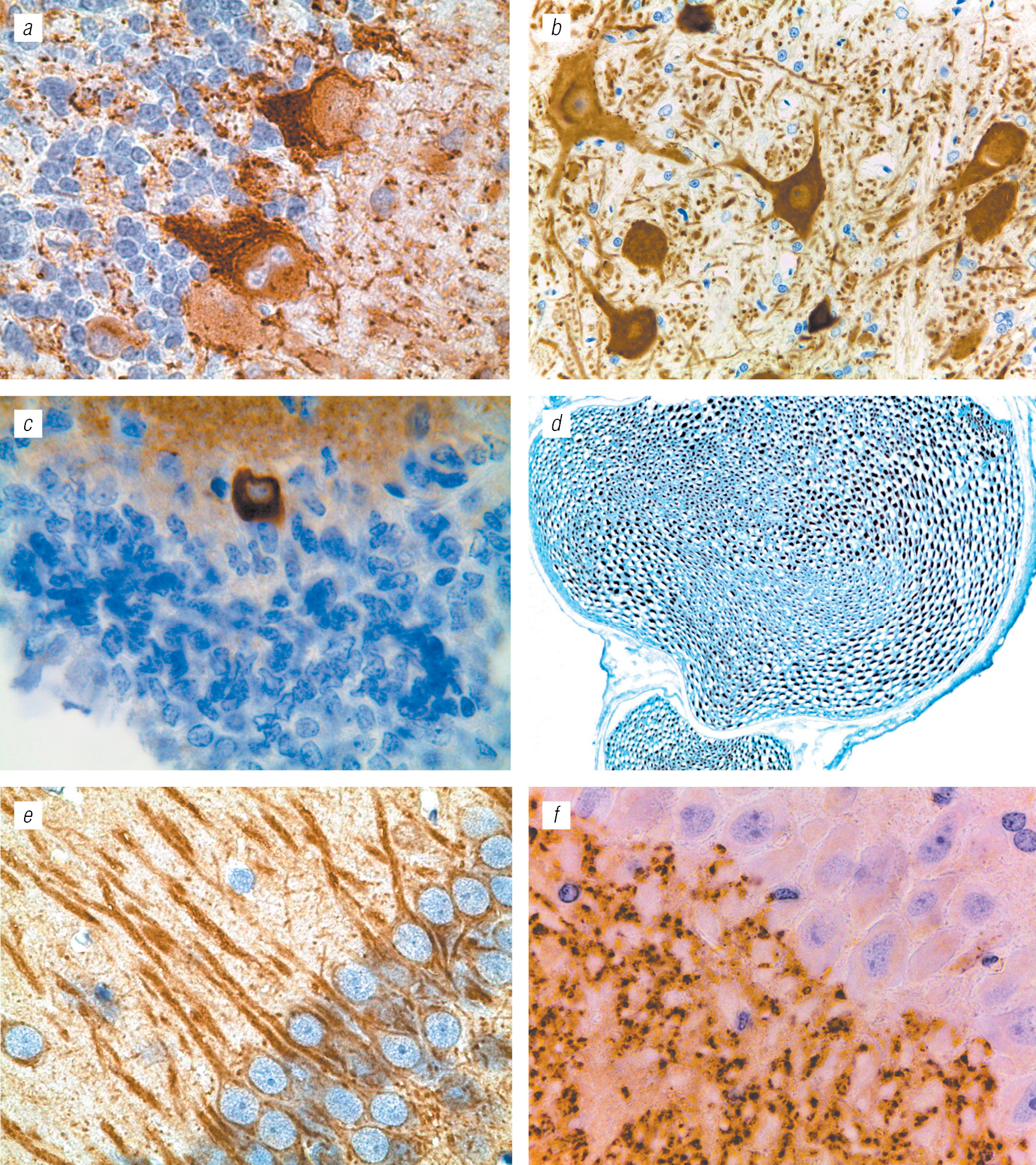 Рис. 2. Иммуногистохимическое выявление различных нейральных маркеров с использованием световой микроскопии: а — ГАМК-ергические структуры в мозжечке крысы. Иммуногистохимическая реакция на GAD67, об. ×100; b — холинергические мотонейроны спинного мозга крысы. Иммуногистохимическая реакция на холинацетилтрансферазу, об. ×100; c — NOS-иммунопозитивный нейрон в субвентрикулярной зоне бокового желудочка головного мозга крысы. Иммуногистохимическая реакция на NO-синтазу (NOS), об. ×100; d — нейрофиламенты в осевых цилиндрах нервных волокон седалищного нерва крысы (поперечный срез). Иммуногистохимическая реакция с применением антител против белков нейрофиламентов (SMI-32), об. ×10; e — альфа-тубулин в отростках пирамидных нейронов в зоне CA1 гиппокампа крысы. Иммуногистохимическая реакция на альфа-тубулин, об. ×100; f — альфа-синуклеин в гигантских синапсах мшистых волокон зоны CA3 гиппокампа. Иммуногистохимическая реакция на альфа-синуклеин, об. ×100; а–c, e, f — подкраска клеточных ядер гематоксилином Джилла, d — подкраска тканевых структур астровым синим