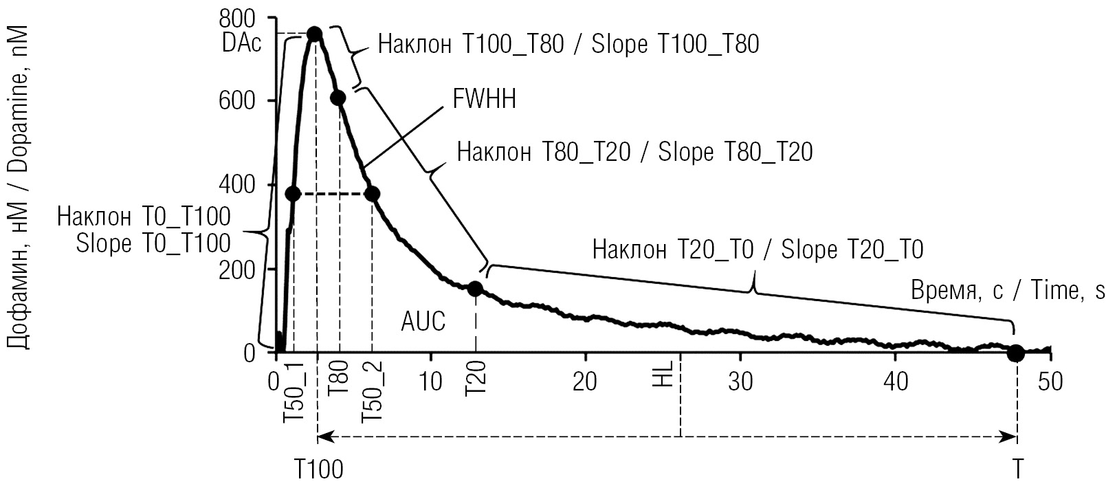 Параметры кинетики стимулированного выброса дофамина в мозге крыс. Сплошная линия — изменение уровня внеклеточного дофамина во времени. DAc — максимальный уровень дофамина, T100 — время достижения максимального уровня; T50_1 и T50_2 — время достижения уровня 50 % максимума на восходящем и нисходящем участке; T80, T20 и T — время достижения уровня 80 и 20 и 0 % максимума на нисходящем участке; T0_T100 — наклон восходящего участка, обусловленный преобладанием выброса дофамина над его обратным захватом; T100_T80, T80_T20 и T20_T0 — наклоны соответствующих сегментов нисходящего участка кривой, обусловленные преобладанием обратного захвата дофамина и его фазами; FWHH (full width at half height) — время между восходящим и нисходящим участками кривой на половине ее высоты; HL (half-life) — половина времени от момента максимума дофамина до исходного уровня; AUC (area under the curve) — площадь под кривой