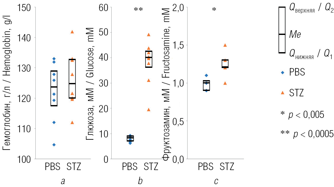 В таблице представлены данные о значениях Me, Q1, Q2 и p для биохимических параметров, определенных в образцах сыворотки крови (цельной крови для Hb), полученных от животных обеих групп. Для подтверждения того, что изменения обмена железа не вызваны случайными ошибками при рандомизации животных, измеряли концентрацию Hb, которая не отличалась у животных контрольной группы и при моделировании сахарного диабета (рис. 1, a). Доказательством развития гипергликемии служило увеличение в крови концентрации глюкозы и фруктозамина (рис. 1, b и c, p = 0,000 и p = 0,001).