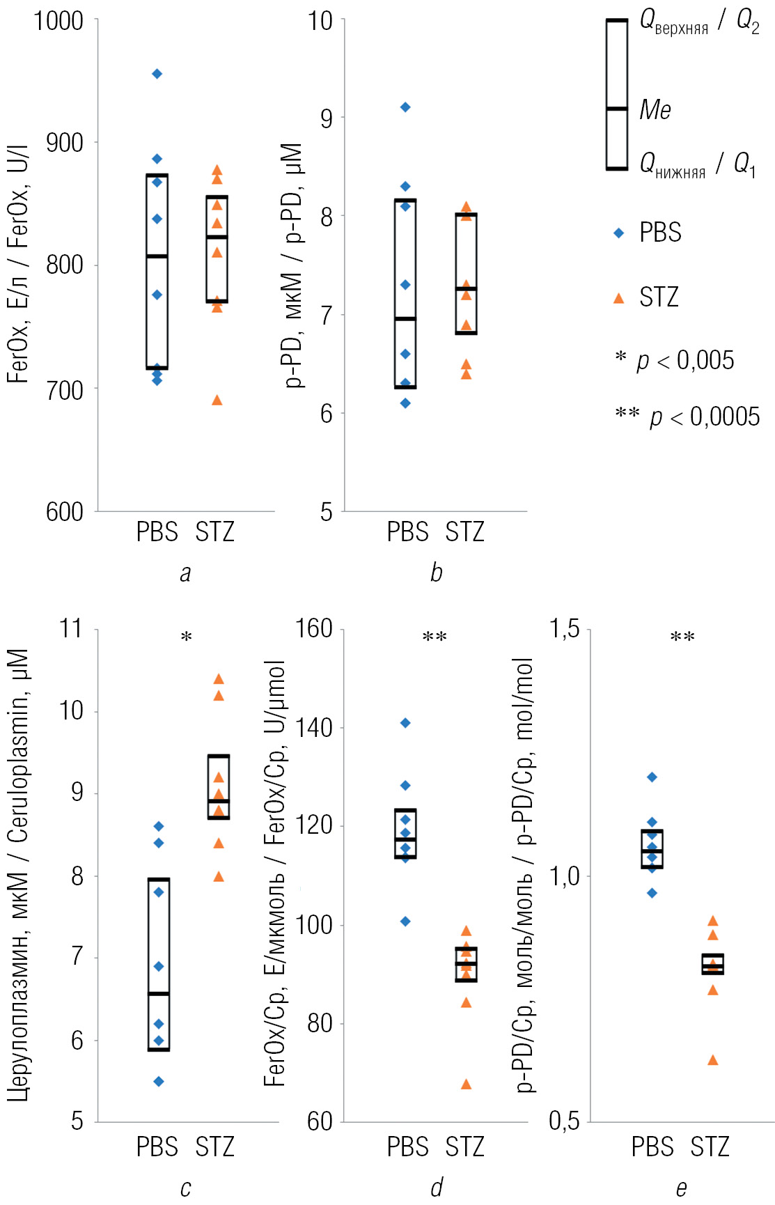 Рис. 2. Ферроксидазная активность (FerOx) (a), пара-фенилендиамин-оксидазная активность (p-PD) (b), концентрация церулоплазмина (c), удельные FerOx (FerOx/Cp) (d) и p-PD церулоплазмина (p-PD/Cp) (e) у крыс контрольной группы (PBS) и крыс, получивших стрептозотоцин (STZ)