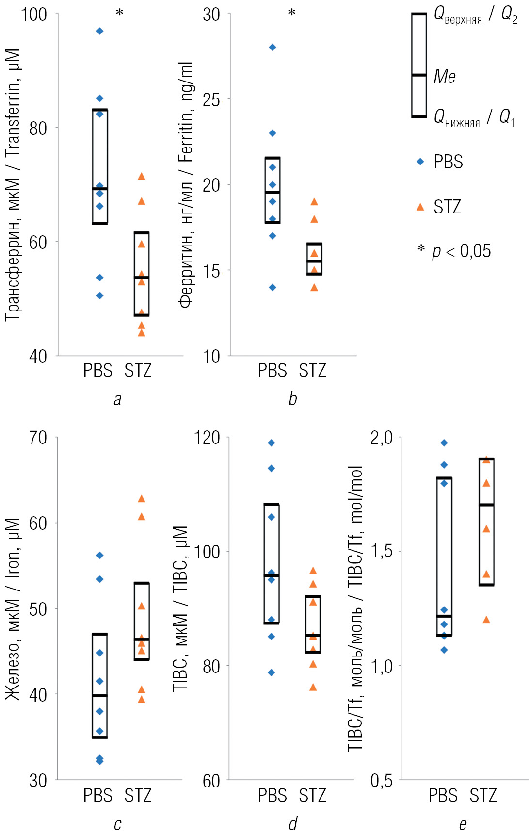 Рис. 3. Концентрация трансферрина (a), ферритина (b), железа (c), общая железосвязывающая способность сыворотки (TIBC) (d) и удельная активность трансферрина (TIBC/Tf) (e) у крыс контрольной группы (PBS) и крыс, получивших стрептозотоцин (STZ)