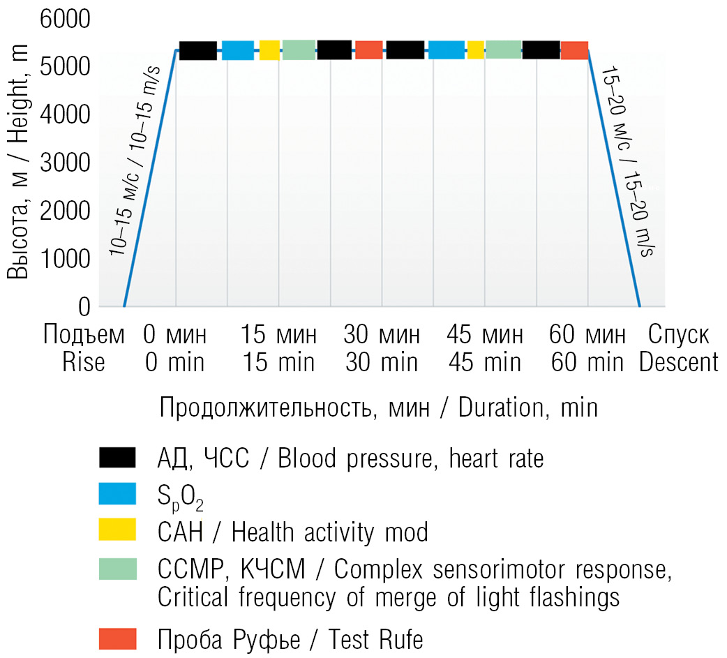 Психофизиологические тесты и оценку физической работоспособности миокарда в процессе подъема выполняли дважды: с 10-й по 30-ю и с 40-й по 60-ю минуту. ЧСС, АД, SpO2 измеряли 4 раза: на 5,25; 35 и 55-й минутах. Сатурацию дополнительно оценивали после физической нагрузки в виде 30 приседаний на 9-й и 39-й минутах подъема. Спуск осуществляли со скоростью 10–15 м/с.