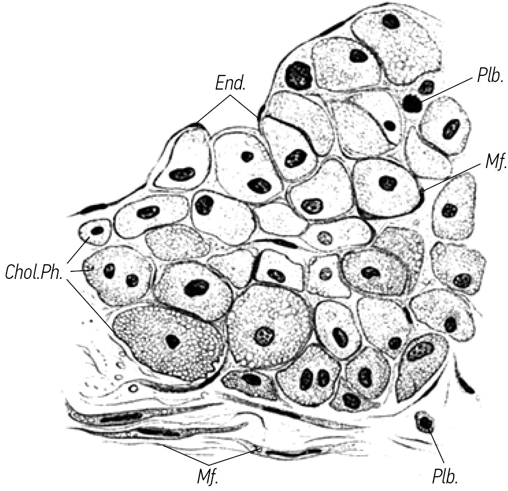 Рис. 1. Типичное поражение, представленное пенистыми клетками у кролика, получавшего 82,7 г чистого холестерина в подсолнечном масле в течение 139 дней. Chol.Ph. — большие фагоциты, переполненные холестерином; End. — эндотелиальные клетки; Plb. — лимфоидные блуждающие клетки; Mf. — гладкомышечные клетки стенки аорты. [Anitschkow N. Über die Veränderungen der Kaninchenaorta bei experimenteller Cholesterinsteatose // Beitr. Pathol. Anat. 1913. Vol. 56. P. 379–404]