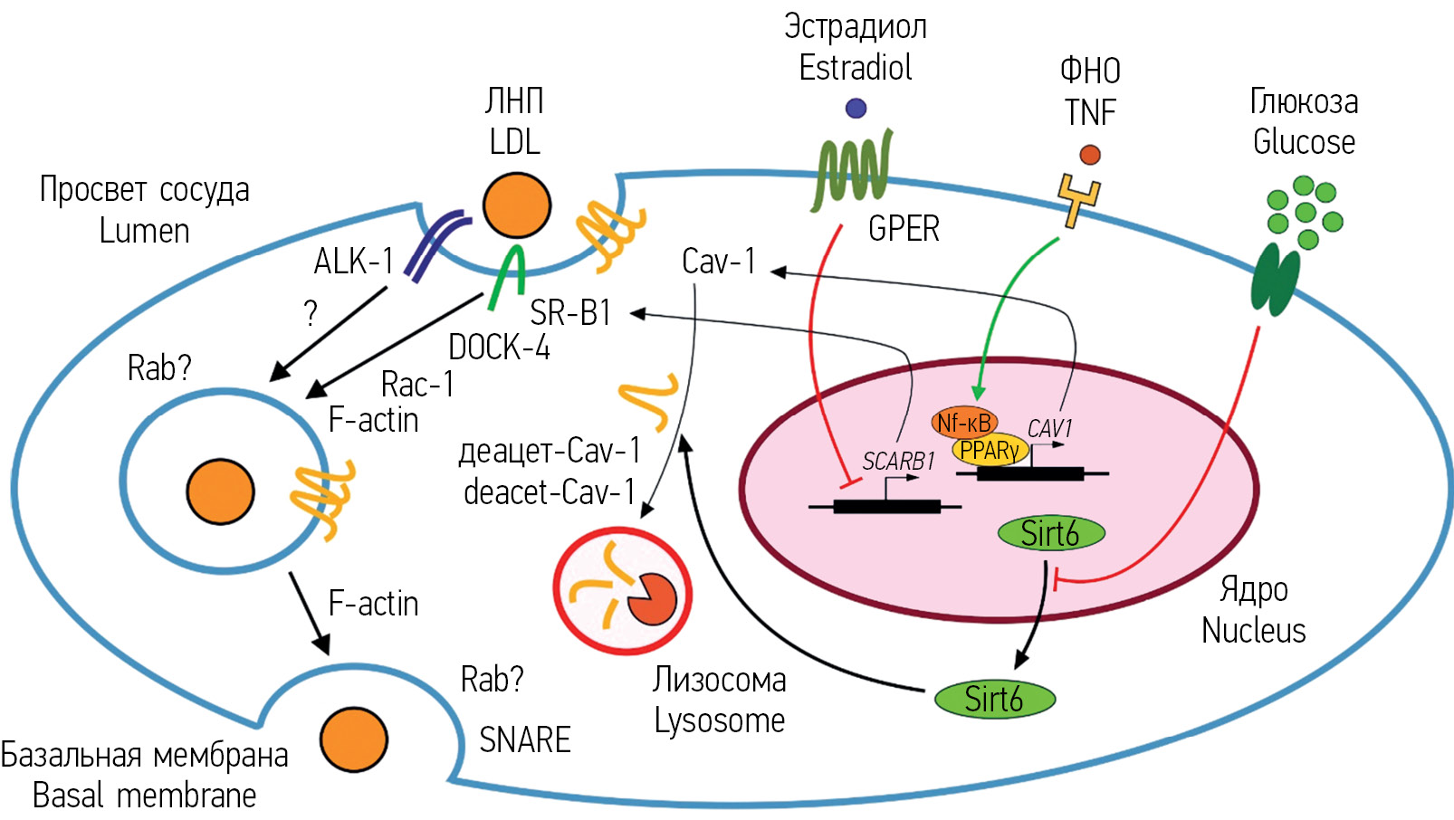 У пациентов с сахарным диабетом наблюдалось повышение скорости исчезновения аутологичных ЛНП и альбумина из кровяного русла через 1 ч после их введения в организм пациентов. Авторы предполагают усиленный транспорт ЛНП в интиму артерий у таких больных [48]. Было установлено, что при обработке культуры эндотелиальных клеток пуповинной вены человека глюкозой в повышенной концентрации отмечалась высокая поглощаемость клетками ЛНП и трансцитоз [49]. Авторы связывают это с увеличением уровня Сav-1 в клетках и угнетающим действием глюкозы в высокой концентрации на аутофагию. Последнее приводит к возрастанию количества Сav-1 в клетках, в том числе на их плазматических мембранах, что в свою очередь способствует активации трансцитоза ЛНП [49]. Вероятный механизм указанного действия глюкозы — подавление ядерно-цитоплазматической транслокации деацетилазы Sirt6, которая деацетилирует Cav-1 и направляет тем самым белок на деградацию в лизосомах [50].