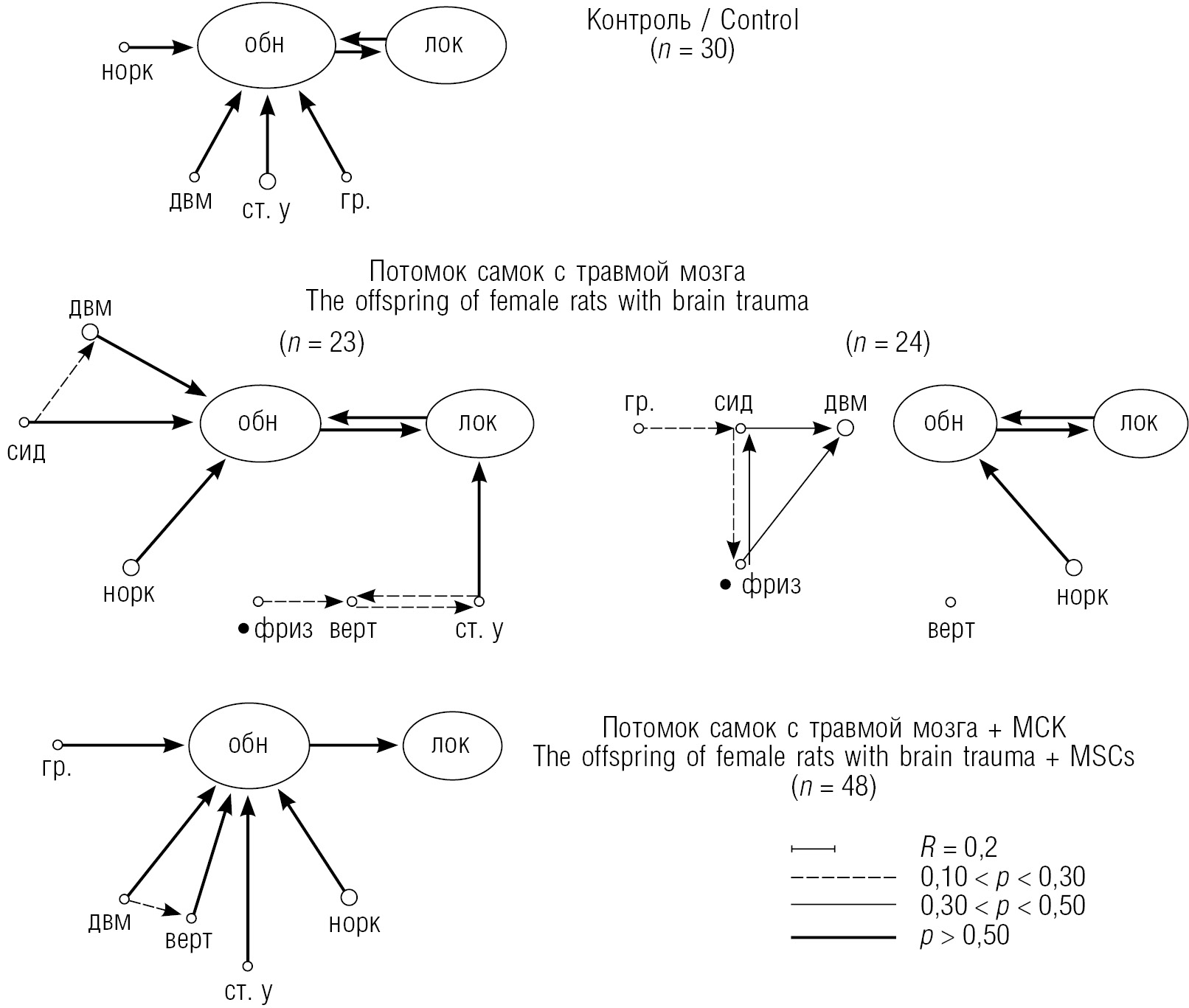 Структура поведения крысят в одномесячном возрасте в тесте ОП зависела от состояния их матерей. Наиболее выраженные изменения поведения зарегистрированы у потомства от самок с травмой мозга (рис. 1). Это прежде всего нарушение целостности поведения и изменение последовательности переходов одних актов в другие. Введение МСК травмированным самкам способствовало восстановлению целостности поведения крысят в тесте ОП, что свидетельствует о положительном эффекте МСК-терапии. Однако восстановление поведения не было полным, графы поведения отличались от контроля.
