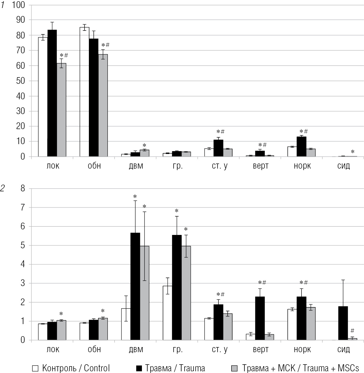 Fig. 2. The behavior of the control and experimental one-month-old rats: 1 — number of acts; 2 — duration of the act. Designations: лок — locomotion, обн — sniffing, двм — movement in place, гр. — grooming, ст. у — stand with support, верт — vertical stand, норк — hole, сид — sitting; * p ≤ 0.05 — significance level compared to control; # p ≤ 0.05 — significance level compared with the trauma group; MSCs — mesenchymal stem cells