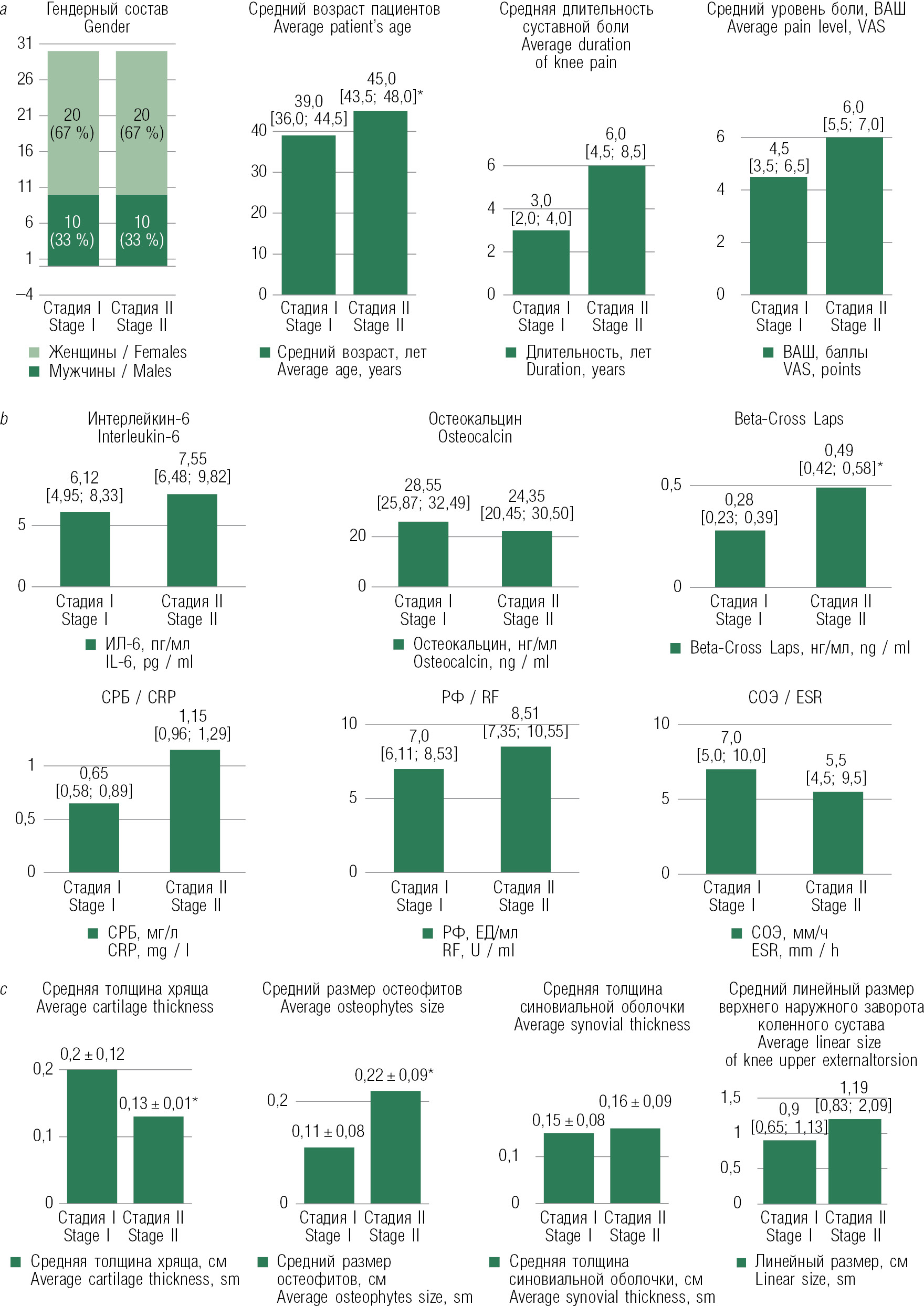 Результаты исследования больных гонартрозом I и II рентгенологических стадий: a — общеклинические данные; b — лабораторные данные; c — данные ультразвукового исследования; * статистически значимые различия при сравнении I и II стадий остеоартрита по t-критерию Стьюдента/U-критерию Манна – Уитни (р < 0,05). Численные значения представлены по типу: медиана [нижний квартиль; верхний квартиль], или среднеарифметическое значение ± стандартное отклонение, или количество человек (процент от группы)