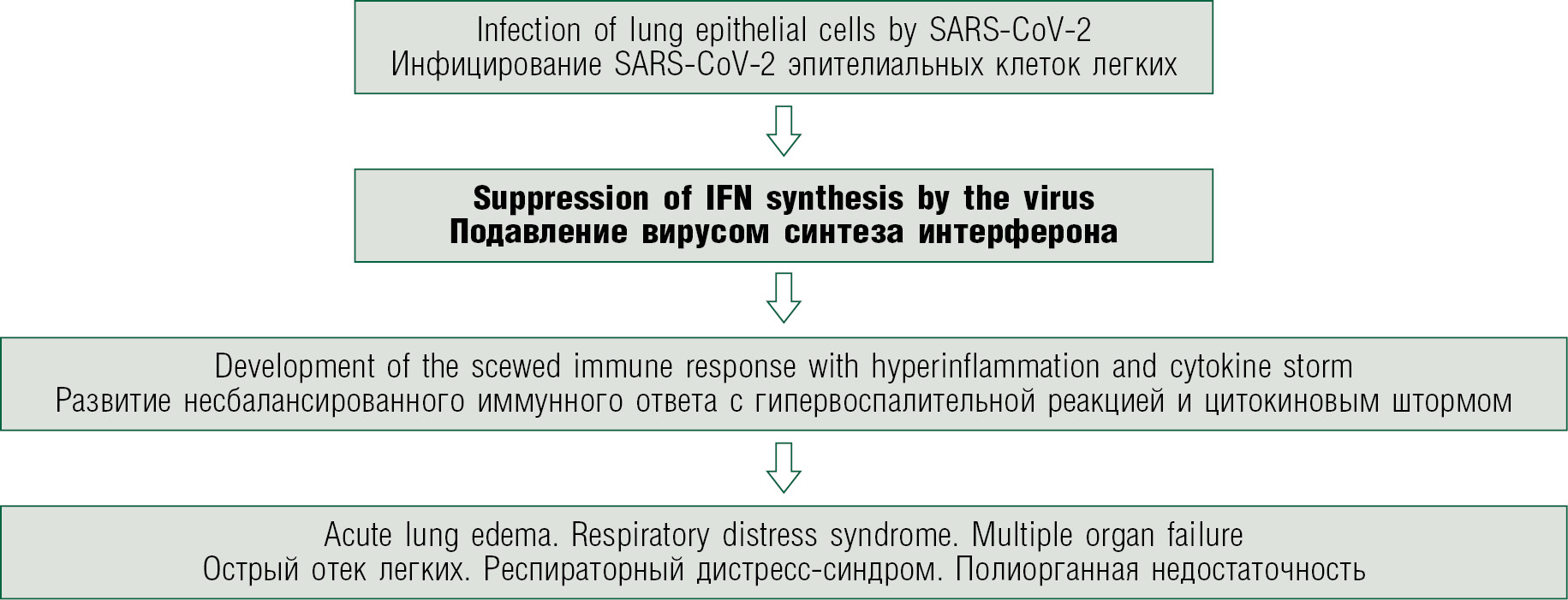In clinical studies, in severe patients with COVID-19, not only decreased but also delayed IFN synthesis was registered, which was accompanied by an early onset of intensive synthesis of pro-inflammatory cytokines and the development of a cytokine storm [32]. Thus, if IFN is not synthesized immediately, but with some delay and in small quantities, this mechanism allows the coronavirus to replicate actively and induce an increased synthesis of pro-inflammatory cytokines. Figure 1 presents the general scheme of the COVID-19 immunopathogenesis.