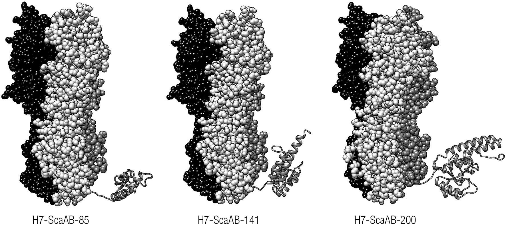 Fig. 1. Visualization of spatial structure of influenza H7 hemagglutinin with insertion of bacterial antigenic cassettes. The ScaAB cassette is shown on one monomer for better perception. The cassette is linked to N-terminus of HA with a flexible linker. The figure was prepared with UCSF Chimera 1.11.2 software