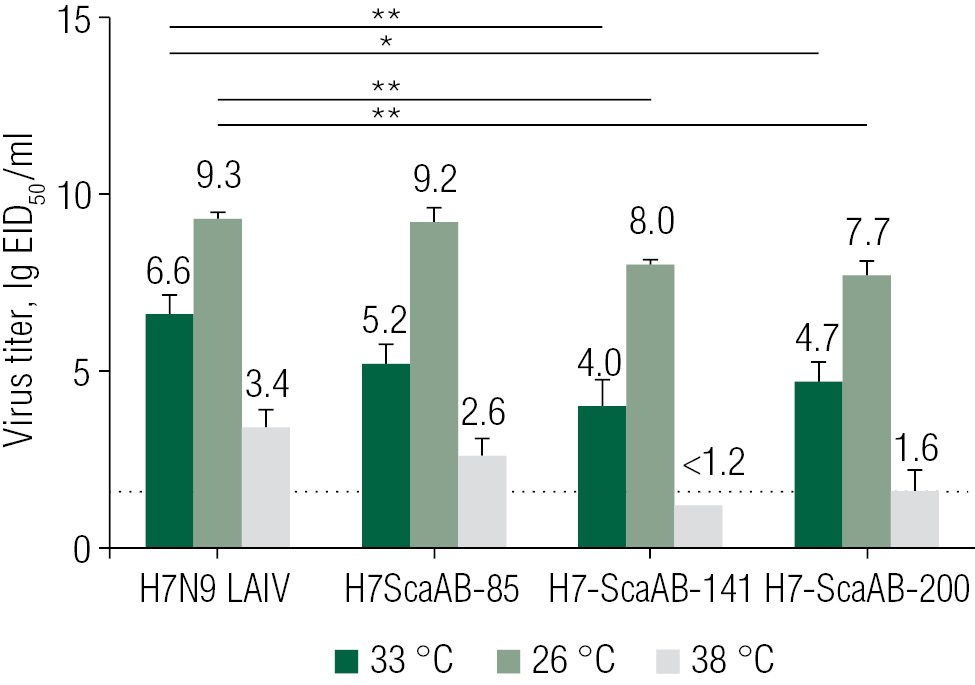 Fig. 2. Titers of recombinant viruses in developing chicken embryos at different temperatures. EID50 — 50% egg infectious dose. Data are shown as Mean ± standard deviation. The differences between groups were assessed by ANOVA (significant for all three temperatures) with post-hoc Dunnett’s test. Significant differences (Dunnett’s test) are indicated as follows: * p ≤ 0.05, ** p ≤ 0.005. The dotted line indicates detection limit