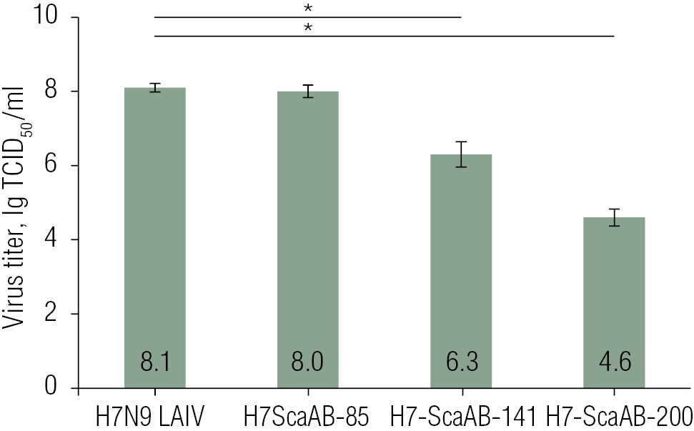 Comparison of the infectious activity of the H7N9 LAIV vector and the chimeric viruses in MDCK cells at optimal temperature 33 °C showed statistically significant differences (Figure 3). Similar to viral replication in eggs, inserts of large-sized ScaAB protein cassettes (141 and 200 a.a.) statistically significantly reduced the infectious activity of the virus at the optimal temperature, whereas the ScaAB-85 insert did not show this negative effect — the virus actively replicated in MDCK cells at the level of the control vaccine strain LAIV H7N9.