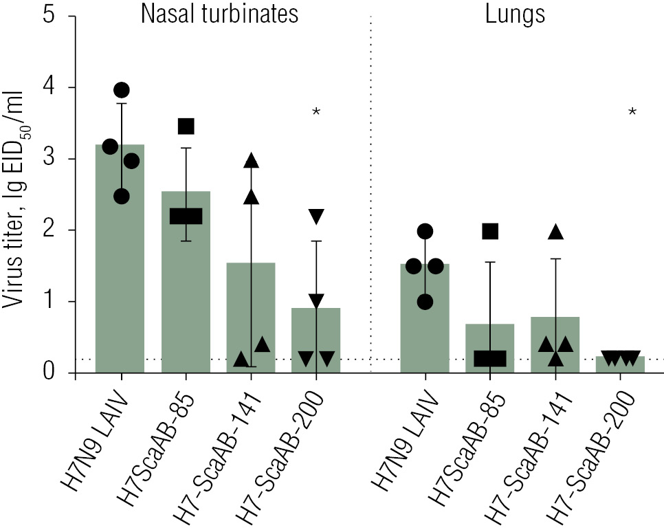 To assess the reproductive activity of the designed vectored vaccines in the upper and lower respiratory tract of mice, the nasal turbinates and lungs were harvested 3 days after intranasal administration of vaccines at a dose of 6.0 lg EID50/50 μl. Virus titers were determined by titration of tissue homogenates in eggs at the optimal temperature. Figure 4 shows that the control strain H7N9 LAIV, used as a viral vector, actively replicated in the upper respiratory tract of mice, while its replication in the lungs was significantly reduced, indicating an attenuated viral phenotype. All the designed vectored vaccines were also unable to grow in the lungs of mice, which indicates the preservation of the vaccine’s attenuated phenotype when a fragment of the bacterial ScaAB protein is inserted into the HA molecule, regardless of the length of the insert. However, the insertion of larger fragments had a negative effect on the level of viral replication in the nasal turbinates: the titer of the ScaAB-141 strain decreased by 1.5 lg EID50, although the difference with the control virus did not reach statistical significance. Insertion of the ScaAB fragment with a size of 200 aa resulted in almost complete inability of the virus to replicate in the mouse respiratory tract (Figure 4, p = 0.02, Dunn’s test).