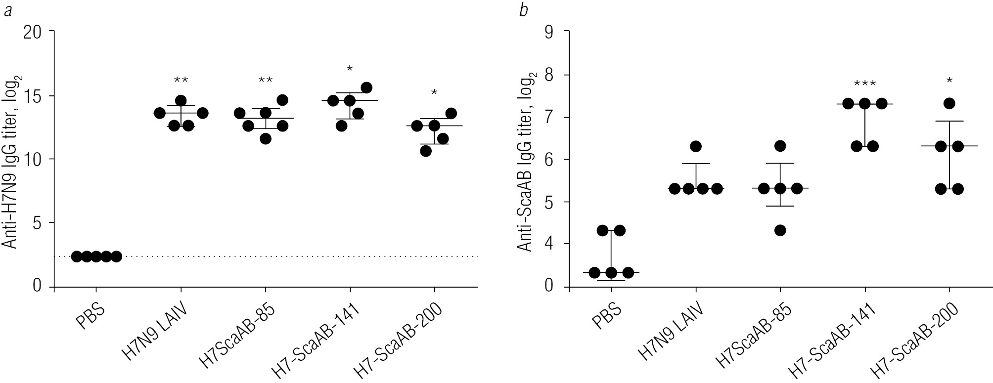 The levels of antibodies detected against the ScaAB protein in all studied groups exceeded the detection limit, which indicates the presence of the background IgG antibodies in BALB/c mice that could react with bacterial antigen. In addition, in the group immunized with the H7N9 LAIV vector, the titers of detected antibodies were noticeably higher than in the control (PBS-immunized group) (Figure 5, b). The detection of anti-ScaAB antibodies in the group of mice that received the control vaccine strain H7N9 LAIV indicates the induction of a fraction of antibodies to the influenza virus that have the ability to cross-react with the bacterial protein. A similar effect was described for pneumococci, where the authors noticed the reduction of the bacterial pathogenic effect in mice vaccinated with an inactivated influenza vaccine [11]. Nevertheless, statistically significant differences in anti-ScaAB IgG levels from the control group (immunized with PBS) were observed only in two groups immunized with the vectored vaccines H7-ScaAB-141 (p = 0.0002, Dunn’s test) and H7-ScaAB-200 (p = 0.011, Dunn’s test) (Figure 5, b).