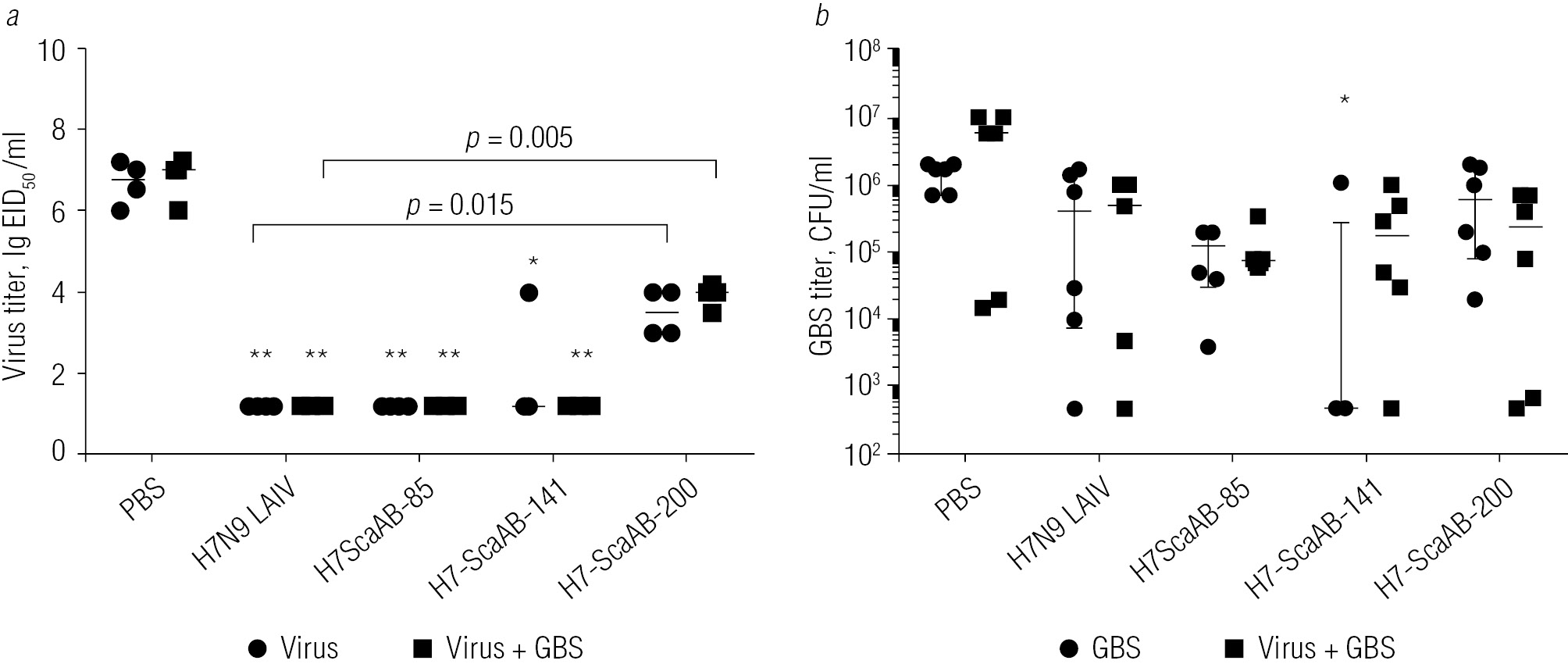 The smallest of the studied inserts of bacterial protein (H7-ScaAB-85) had no negative effect on the levels of virus replication in the mouse nasal turbinates, leading to the development of high levels of protective virus-specific antibodies, comparable to those of the control H7N9 LAIV group. However, this bacterial fragment was not sufficient to induce a GBS-specific humoral immune response, and, as a consequence, mice immunized with this vaccine were not protected against bacterial infection. Despite the reduced replicative activity in the in vitro system, the vectored vaccine H7-ScaAB-141 actively replicated in the upper respiratory tract of mice, which also led to the induction of high levels of virus-specific antibodies. In addition, this insert provided the development of GBS-specific antibodies that were able to suppress the growth of GBS in the lungs of immunized mice, thereby indicating the ability of combined vectored vaccines to afford dual protection against viral and bacterial infections. Insertion of a longer ScaAB fragment (strain H7-ScaAB-200) led to a significant decrease in the replicative activity of the virus both in vitro and in vivo. As a result, vaccinated mice were not completely protected against infection with a virulent influenza virus, and, despite the presence of a high number of B- and T-cell epitopes of the ScaAB protein, a weak immune response to this protein was developed in animals.