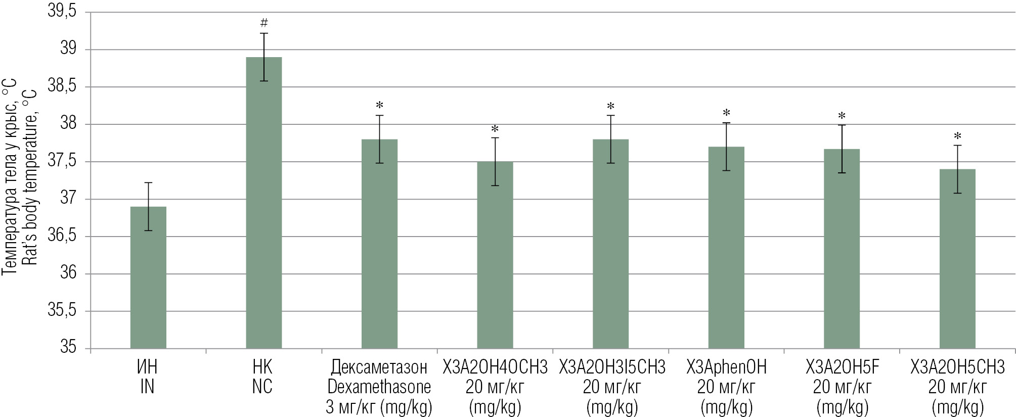 Fig. 1. Effect of the test-compounds and dexamethasone on changes in rat’s body temperature under experimental “cytokine storm” conditions. IN — intact animals; NC — Negative control group; # statistically significant relative to intact animals (Newman-Keuls test, p < 0.05); * statistically significant relative to the negative control group (Newman – Keuls test, p < 0.05)