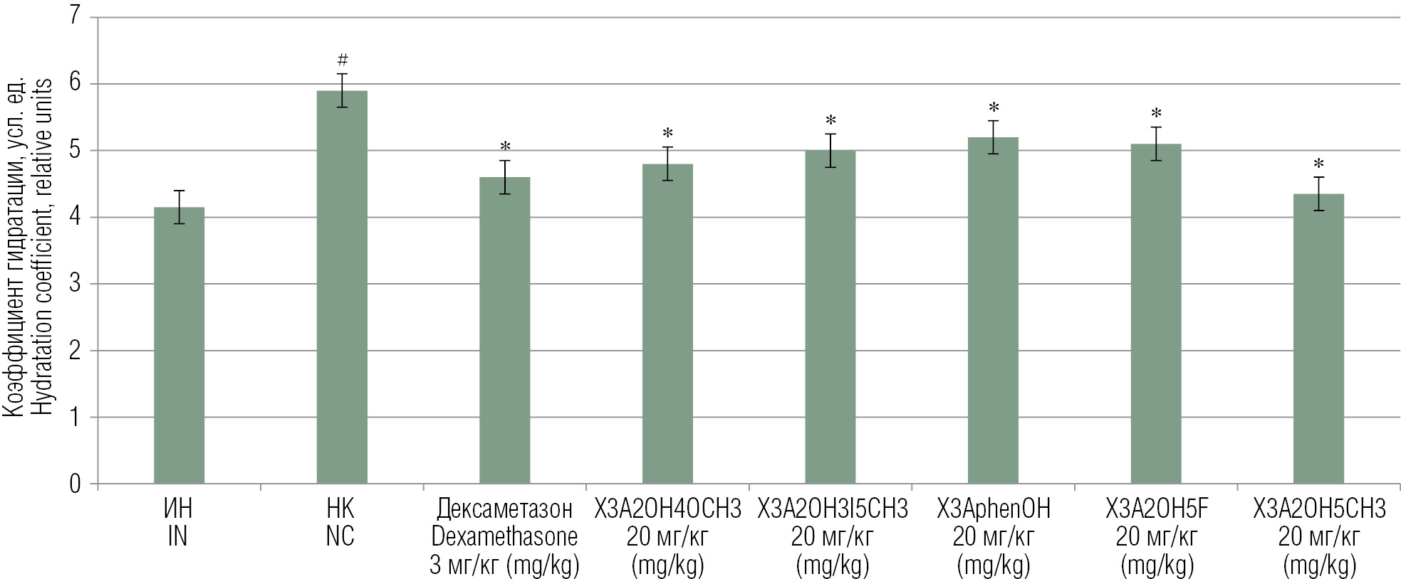 Fig. 2. The effect of the test-compounds and dexamethasone on the change in the severity of pulmonary edema in rats under the conditions of an experimental “сytokine storm”. IN — intact animals; NC — Negative control group; # statistically significant relative to intact animals (Newman – Keuls test, p < 0.05); * statistically significant relative to the negative control group (Newman – Keuls test, p < 0.05)