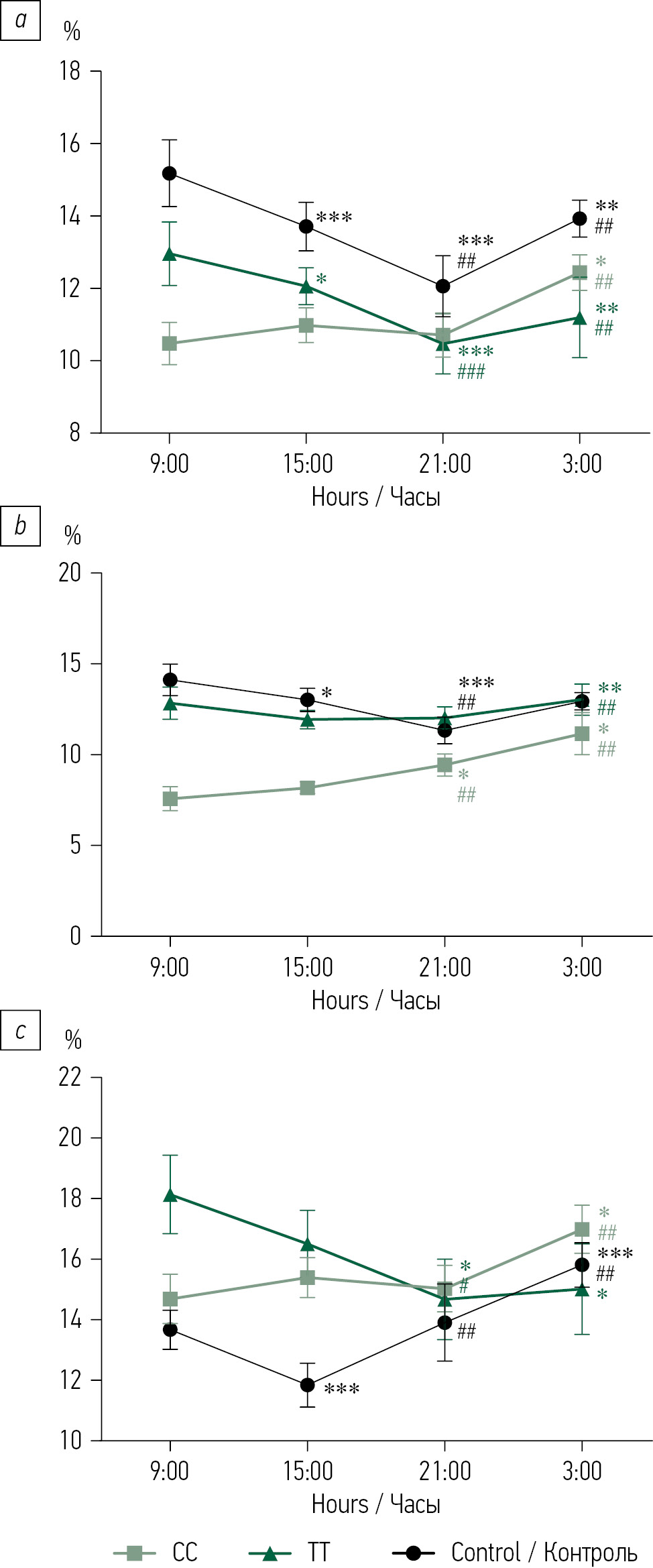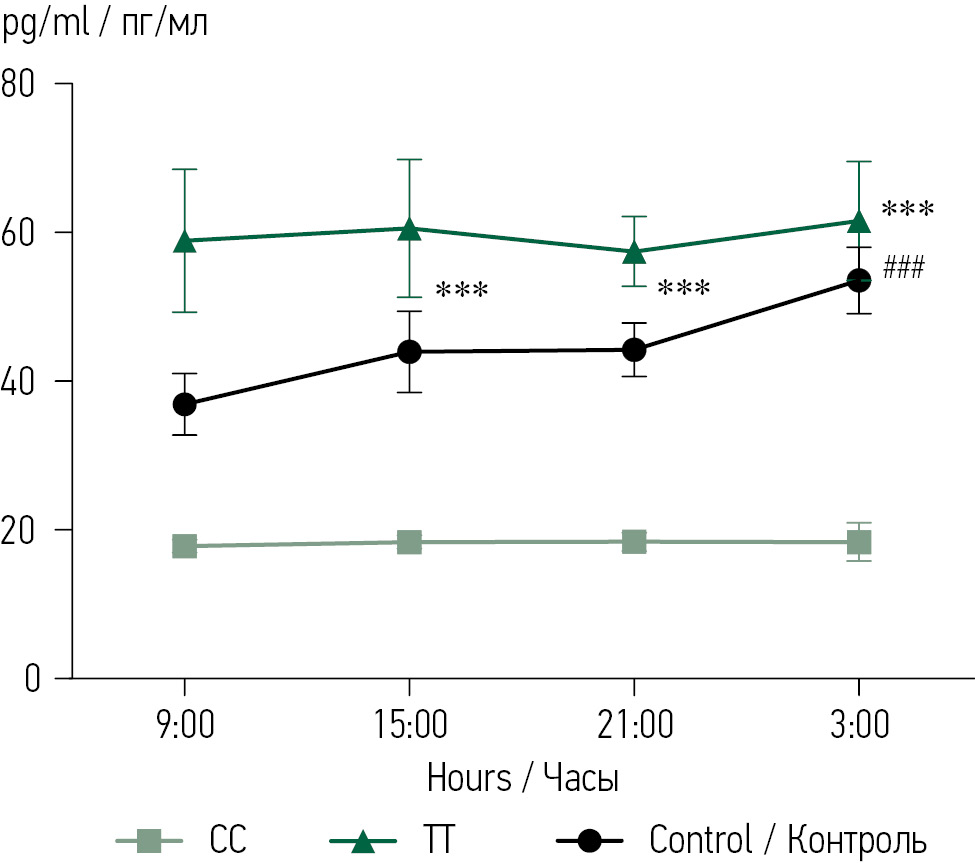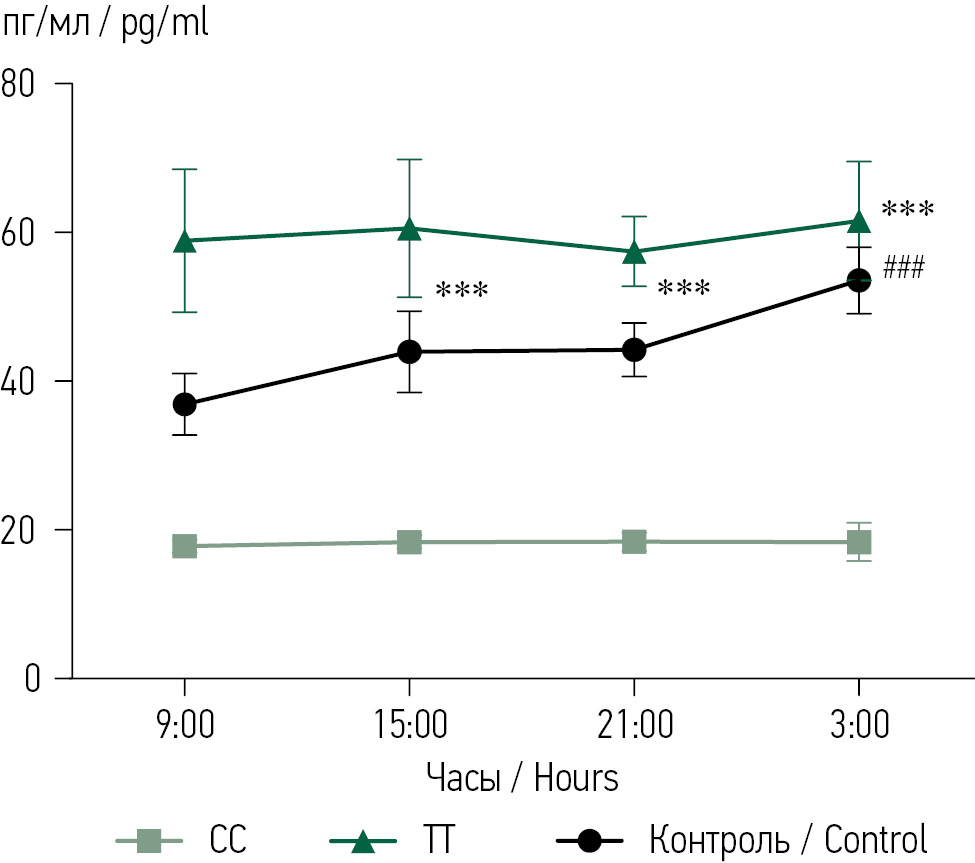Fig. 1. Daily dynamics of melatonin content in the blood of mice. *** p ≤ 0,0005 in comparison with the indicators at 9:00; ### р ≤ 0,0005 in comparison with the indicators at the previous time point. Here and further: СС — I experimental group; TT — II experimental group; Control — control group