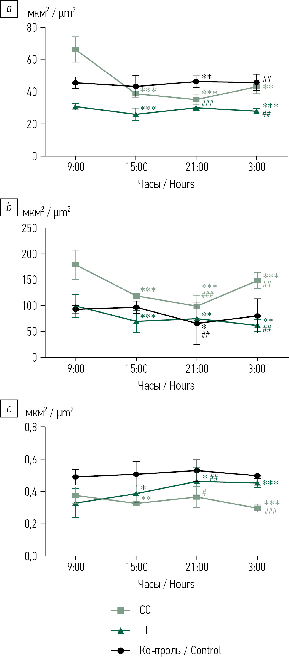 Рис. 3. Суточная динамика изучаемых микроморфометрических показателей клеток меланомы B16: а — площадь ядер; b — площадь клеток; с — ядерно-цитоплазматическое отношение. * р ≤ 0,05, ** р ≤ 0,005, *** р ≤ 0,0005 в сравнении с показателями в 9:00; # р ≤ 0,05, ## р ≤ 0,005, ### р ≤ 0,0005 в сравнении с показателями в предыдущую временную точку