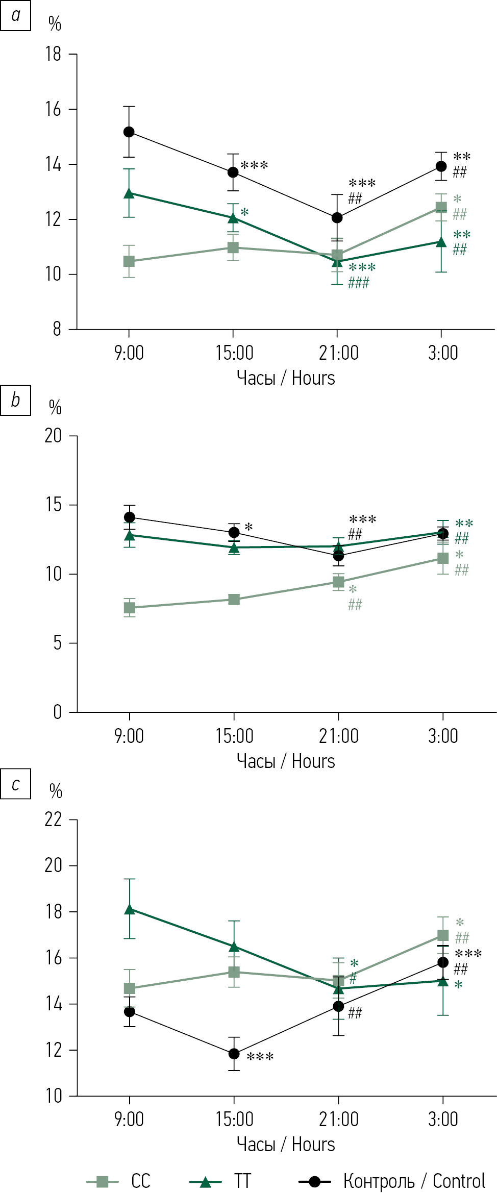 Рис. 5. Суточная динамика экспрессии изученных генов в клетках меланомы B16: а — Bmal1; b — Clock; с — Per2. * р ≤ 0,05, ** р ≤ 0,005, *** р ≤ 0,0005 в сравнении с показателями в 9:00; # р ≤ 0,05, ## р ≤ 0,005, ### р ≤ 0,0005 в сравнении с показателями в предыдущую временную точку