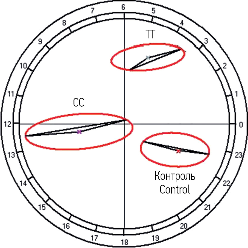 Рис. 2. Результаты косинор-анализа суточной динамики содержания мелатонина в крови мышей
