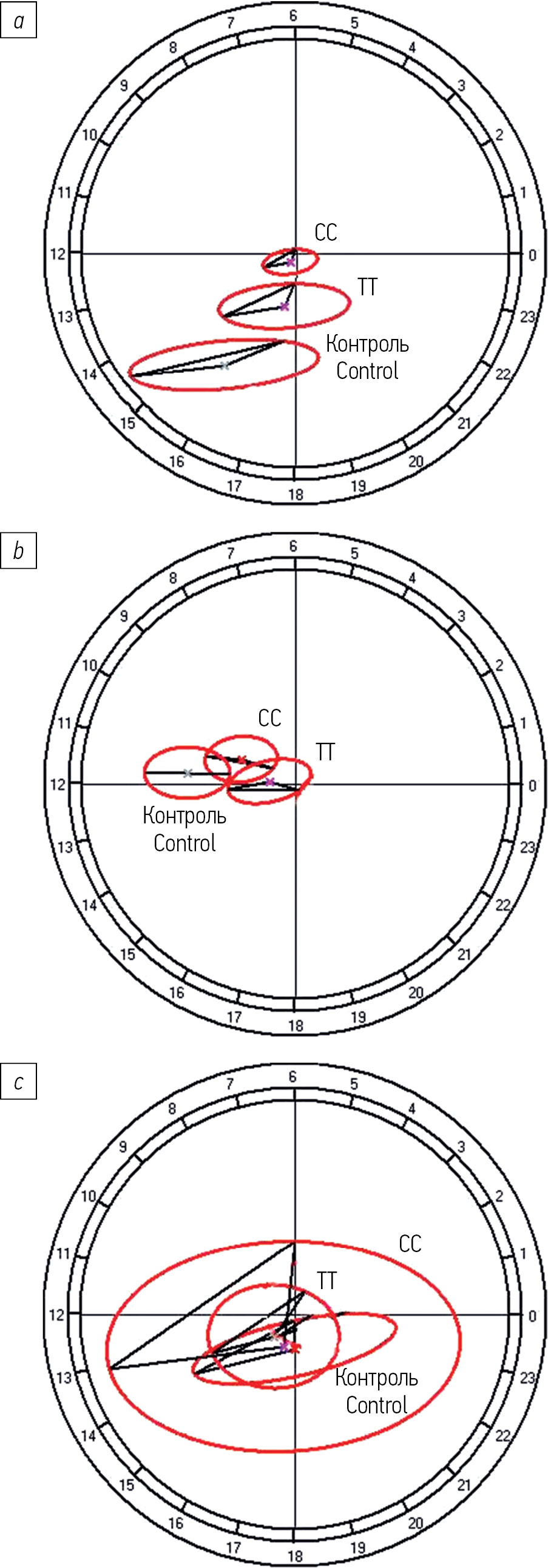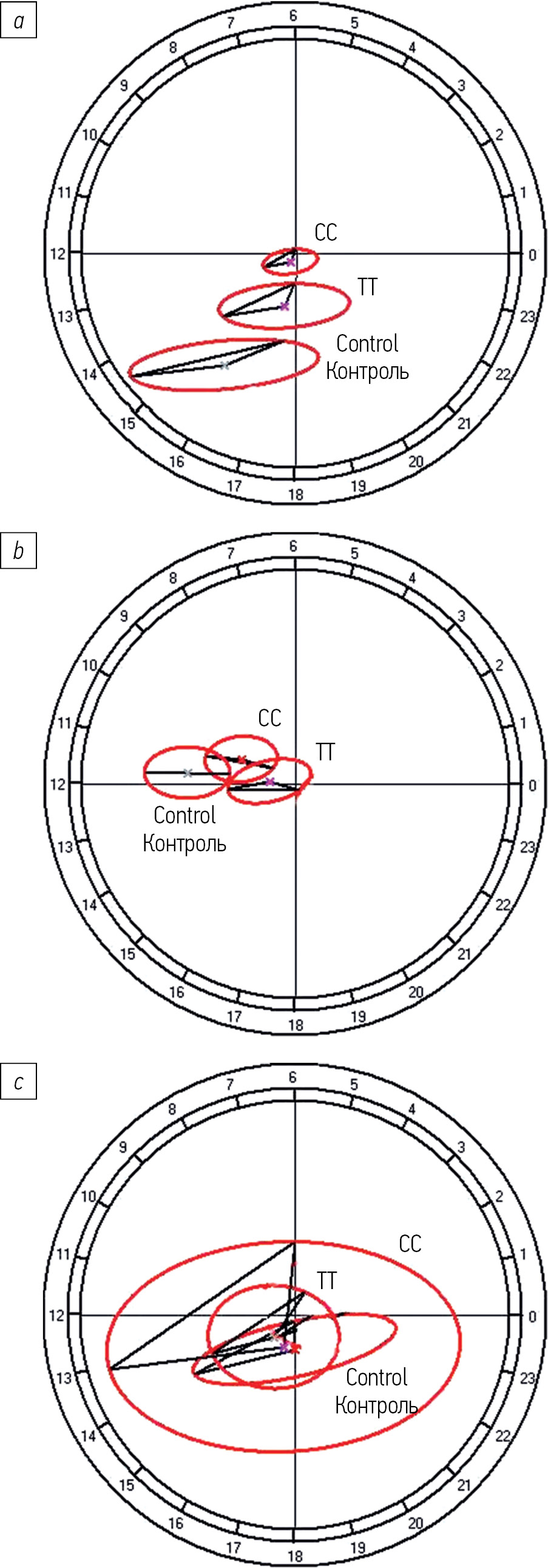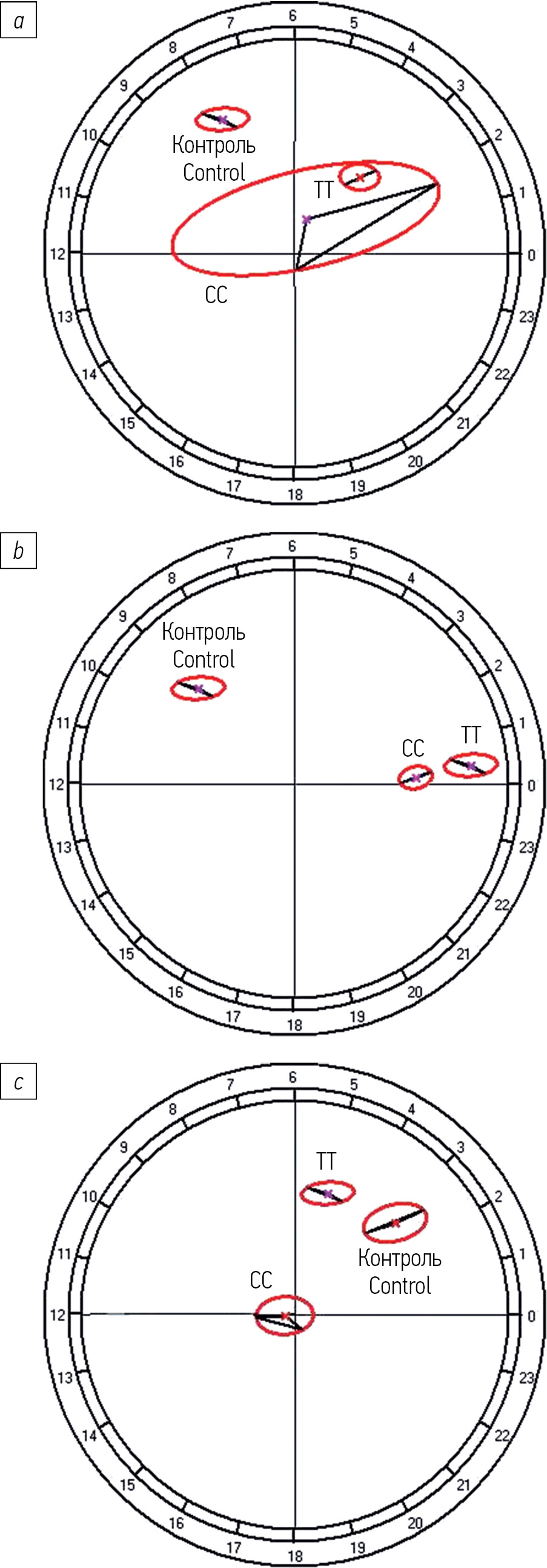 Рис. 4. Результаты косинор-анализа суточной динамики площади ядра (a), клетки (b) и ядерно-цитоплазматическое отношение (c) клеток меланомы B16