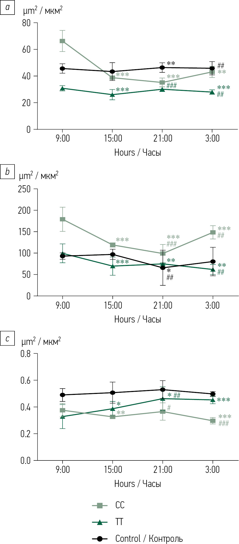 Fig. 3. Daily dynamics of the studied micromorphometric parameters of B16 melanoma cells: a — nuclei area; b — cell area; c — nuclear-cytoplasmic ratio. * p ≤ 0,05, ** p ≤ 0,005, *** p ≤ 0,0005 in comparison with the indicators at 9:00; # p ≤ 0,05, ## р ≤ 0,005, ### р ≤ 0,0005 in comparison with the indicators at the previous time poin
