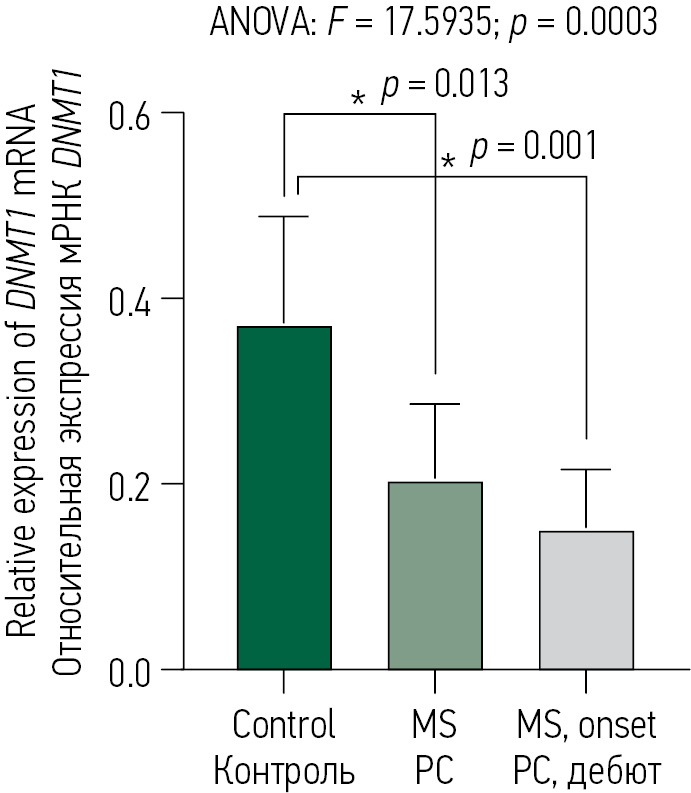 Fig. 2. The changes in the DNMT1 mRNA expression level in peripheral blood mononuclear cells in patients with multiple sclerosis (MS). Data are presented as means and the error of the mean; * significant differences between groups according to the results of post-hoc analysis, p < 0.05 (Tukey’s test for unequal samples)