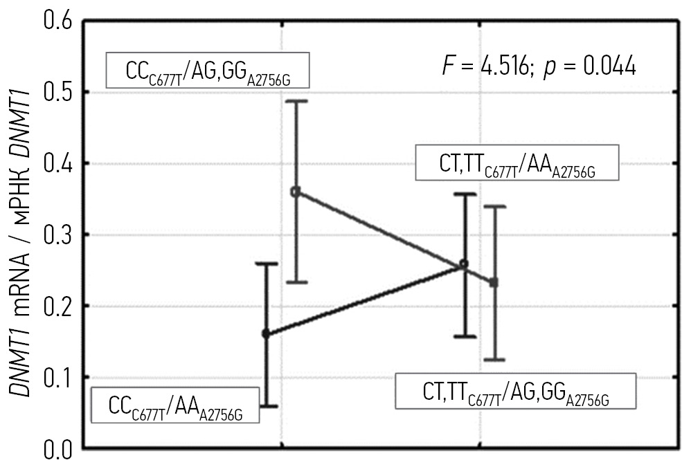 The findings of this study did not reveal an isolated effect of polymorphic variants of folate cycle genes on the level of DNMT1 expression. However, we demonstrated the presence of a combined effect of genotypes for polymorphisms C677T of the MTHFR gene and A2756G of the MTR gene. When genotypes CCC677T/AG,GGA2756G were combined, DNMT1 expression values were the highest. These findings are consistent with those of previous studies, which indicate that the T allele of the C677T polymorphism is associated with DNA hypomethylation, and the G allele of the A2756G variant of the MTR gene is associated with hypermethylation [41]. Interestingly, the cumulative effect of polymorphic variants of folate cycle genes has been reported previously [43]. For further studies, it would be beneficial to verify the assumption that the genotype CCC677T/AAA2756G, which exhibits the greatest reduction in DNMT1 expression levels, will be associated with a greater risk of disease development and/or progression.