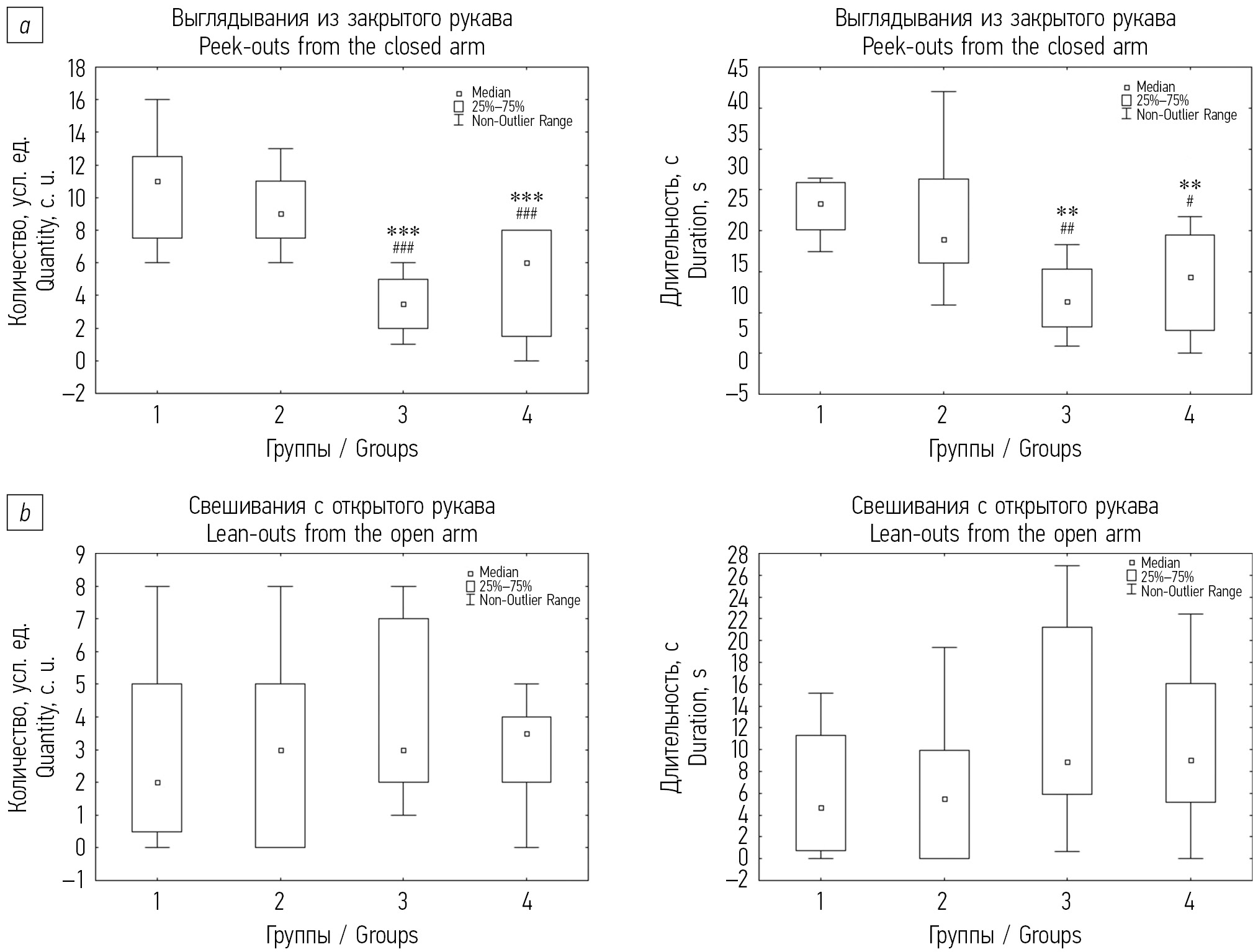 Рис. 2. Исследовательская активность самцов крыс по показателям количества и длительности выглядываний из закрытого рукава (а) и свешиваний с открытого рукава (b) установки «приподнятый крестообразный лабиринт». Обозначения те же, что и на рис. 1. ** p < 0,01, *** p < 0,001 — статистически значимые отличия от показателей животных контрольной группы 1. # p < 0,05, ## p < 0,01, ### p < 0,001 — значимые отличия от показателей животных группы 2 без психогенной травмы, двукратно помещенных в террариум к питону