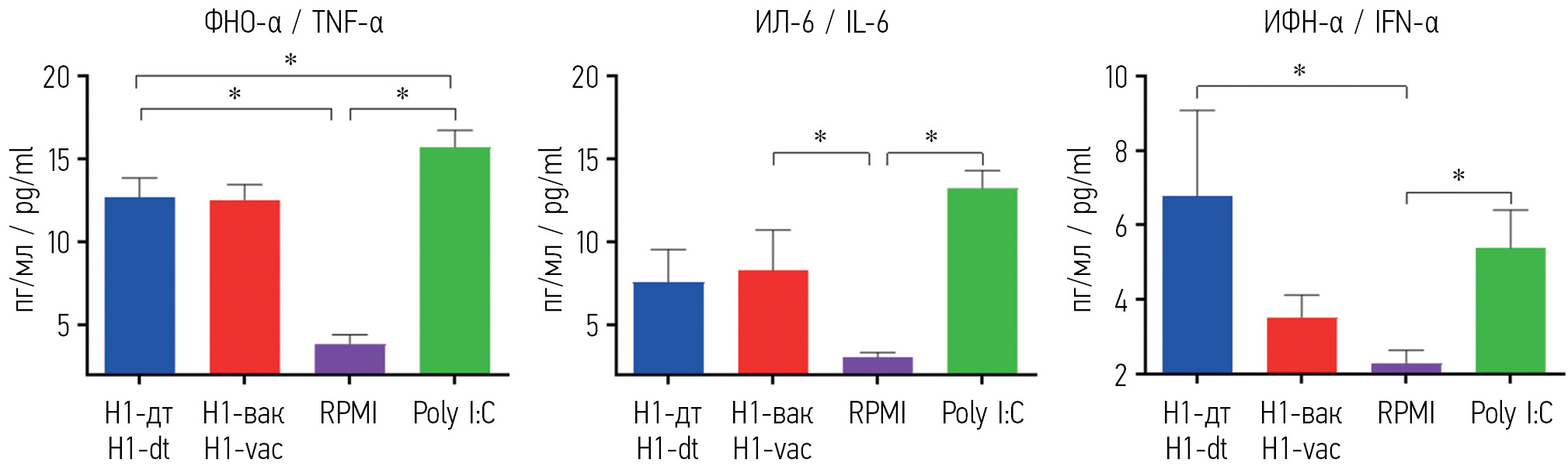 Рис. 1. Результаты изучения продукции ранних цитокинов в клетках линии моноцитов-макрофагов человека. H1-дт — A/Южная Африка/3626/2013(H1N1)pdm09; Н1-вак — A/17/Южная Африка/2013/01(H1N1)pdm09; Poly I:C — полиинозиновая:полицитидиловая кислота. Лунки, содержащие только среду RPMI, использовали в качестве отрицательного контроля. Представлены данные двух независимых экспериментов, выполненных в двух повторностях каждый. * р < 0,05 по сравнению с лунками с отрицательным контролем. ФНО-α — фактор некроза опухоли α; ИЛ-6 — интерлейкин 6; ИФН-α — интерферон α