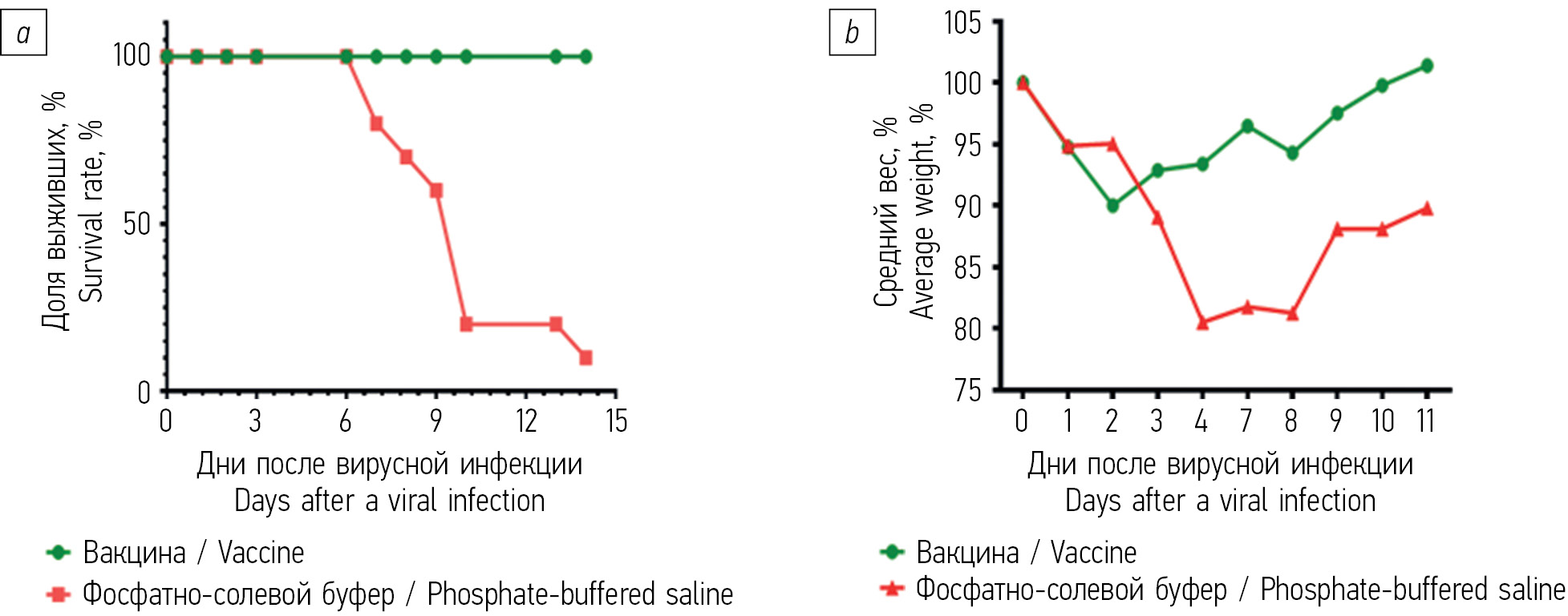 Животных содержали в соответствии с ГОСТ 33216–2014 «Правила работы с лабораторными грызунами и кроликами». Все процедуры с животными проводили согласно Руководству по проведению доклинических исследований лекарственных средств [14]. Исследование было одобрено Локальным комитетом по этике ухода и использования животных в ФГБНУ «Институт экспериментальной медицины», Санкт-Петербург, протокол № 3/23 от 20.09.2023. В исследовании использовали самок мышей линии CBA (питомник «Рапполово», Ленинградская область). Рандомизированным группам животных (по 10 мышей в каждой группе) под легким эфирным наркозом вводили интраназально 50 мкл вакцинного штамма ЖГВ A/17/Южная Африка/2013/01(H1N1)pdm09 с содержанием 6 lg ЭИД50, распределяя объем равномерно между ноздрями. Животным контрольной группы инокулировали фосфатный буферный раствор таким же образом. Заражение проводили на 6-й день после иммунизации вирусом A/Индонезия/5/2005(H5N1) IDCDC-RG2 в инфекционной дозе 6 lg ЭИД50, что соответствует пяти 50 % мышиным летальным дозам. Выживаемость животных наблюдали в течение двух недель после заражения вирусом.