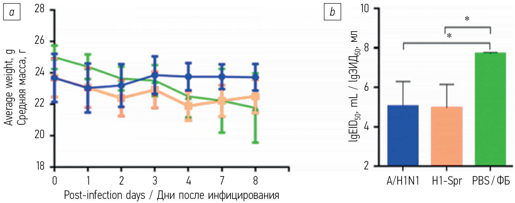 Рис. 5. Результаты изучения защитного действия иммунизации рекомбинантным вирусом H1-Spr: a ― динамика изменения средней массы тела мышей после экспериментального заражения (n = 10); b ― репродукция заражающего вируса A/Калифорния/07/09 (H1N1)pdm09-МА в легких мышей на 3-й день после экспериментального заражения (n = 3). ФБ — неиммунизированные животные
