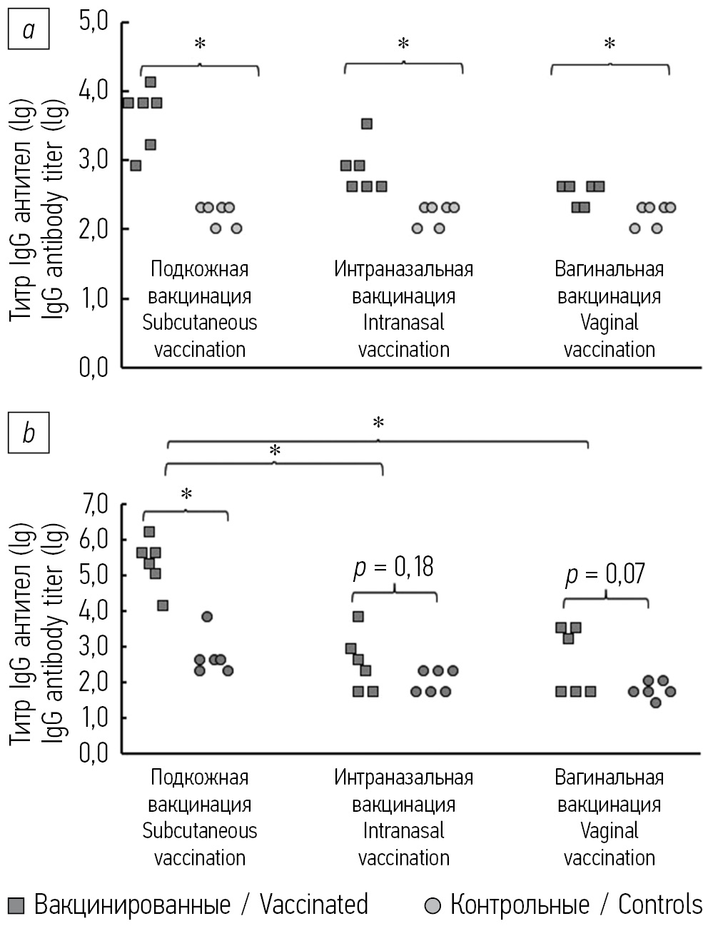 Повторная иммунизация вызвала дальнейшее накопление специфических антител в циркуляции. Подкожная иммунизация обеспечивала достоверный по отношению к контролю и обоим мукозальным способам вакцинации прирост уровня специфических антител класса G (рис. 2, b). При интраназальном и интравагинальном способах введения также было выявлено превышение титра специфических антител у вакцинированных животных, хотя при имеющемся численном основании отличия между контрольными и иммунными сыворотками не достигали уровня достоверности.