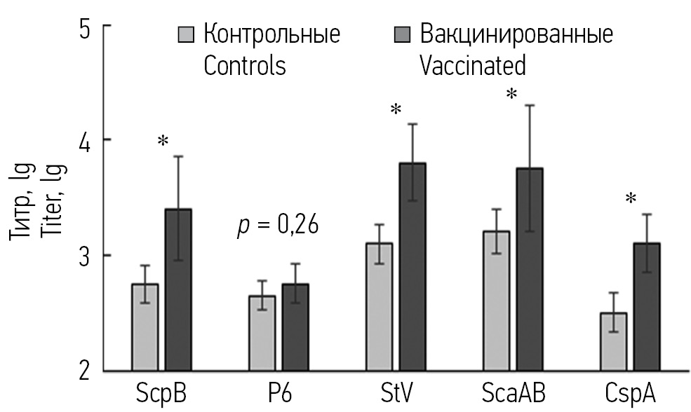 Белок Su4 представляет собой искусственно сконструированный гибридный полипептид, в состав которого входят линейные антигенные детерминанты белков, принадлежащих СГВ. Мы показали, что в пуле Su4-специфических IgG присутствовали антитела к белкам СГВ, фрагменты которых вошли в состав химерной молекулы. На рис. 4 представлены результаты иммуноферментного анализа, в котором титрование одних и тех же сывороток вели на планшетах с сорбированными рекомбинантными полипептидами P6, CspA, ScpB, ScaAB, StV, соответствующими рекомбинантным белкам Вас, CspA, ScpB (С5а-пептидаза), ScaAB и SspB1 GBS.