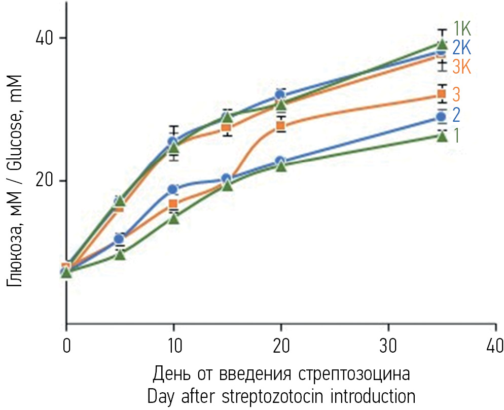 Figure. Changes in fasting glucose concentration in venous blood of animals (rats) with experimental hyperglycemia under different lactoferrin regimens. Data are presented as median and quartiles [Q1; Q3]. 1, Lactoferrin (250 mg/kg) administration on days 5, 3, 1 days before and 2, 4, 6, 8 days after streptozotocin introduction. 2, Lactoferrin (250 mg/kg) administration daily, starting 5 days before streptozotocin introduction. 3, Lactoferrin (50 mg/kg) administration daily on days 1 to 5 after streptozotocin introduction. Curves of the “K” family — control groups of animals, in which isotonic saline instead of lactoferrin was used in the same volume and regimen as for lactoferrin