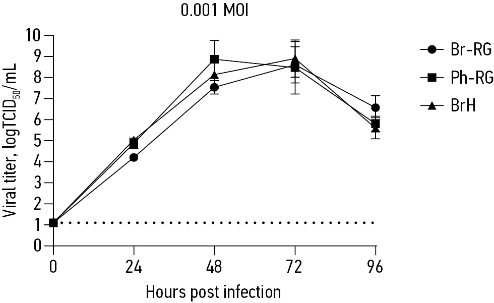 Furthermore, both Br-RG and Ph-RG, as well as the BrH reassortants grew efficiently in MDCK cells. Their titers ranged from 7.8 to 8.5 logTCID50/mL (see Fig. 2) with MOI = 0.001, reaching peak titers of no less than 8.0 logTCID50/mL. These data indicate the feasibility of LAIV production using cell culture technologies.